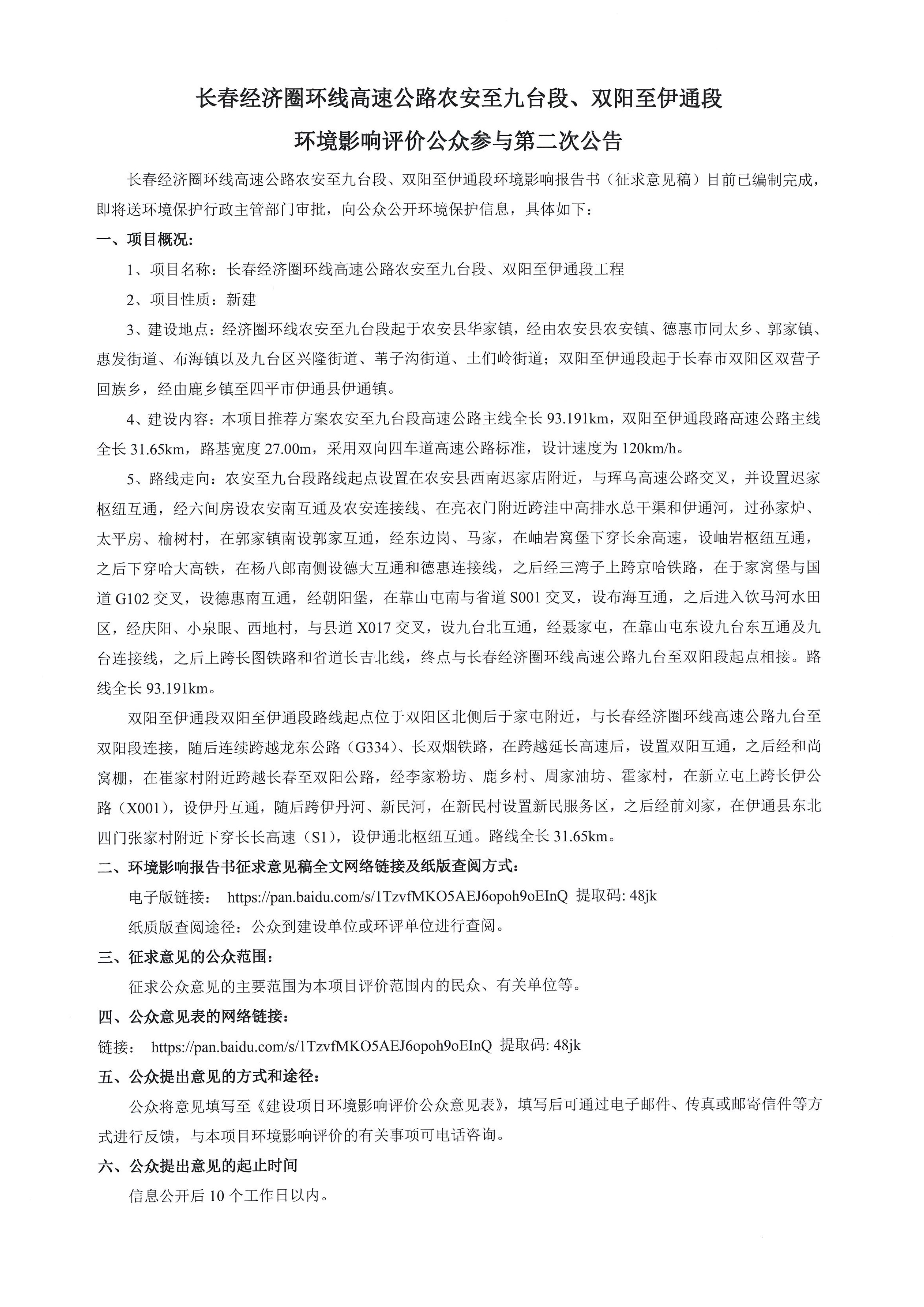 长春经济圈环线高速公路农安至九台段、双阳至伊通段环境影响评价公众参与第二次公告