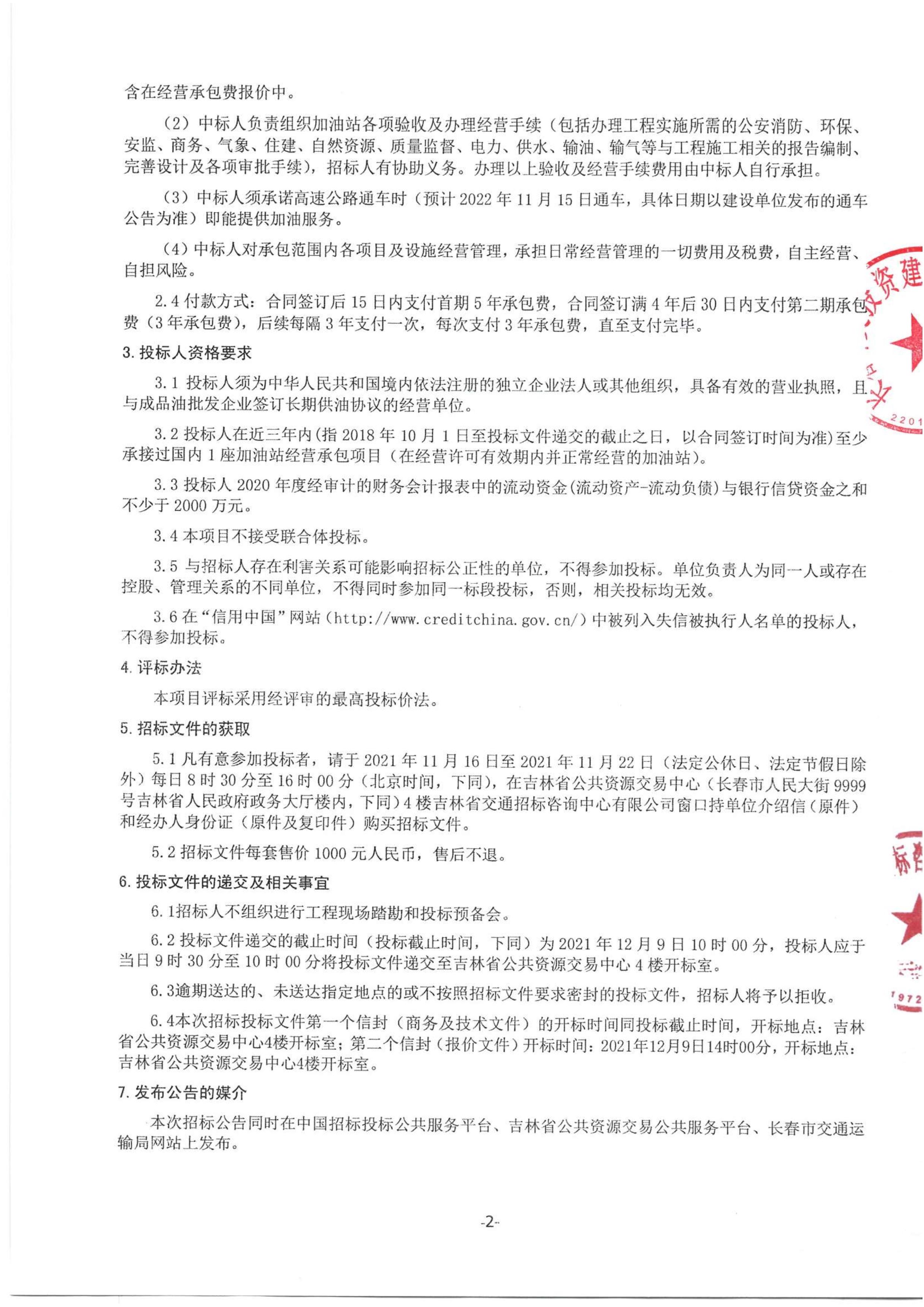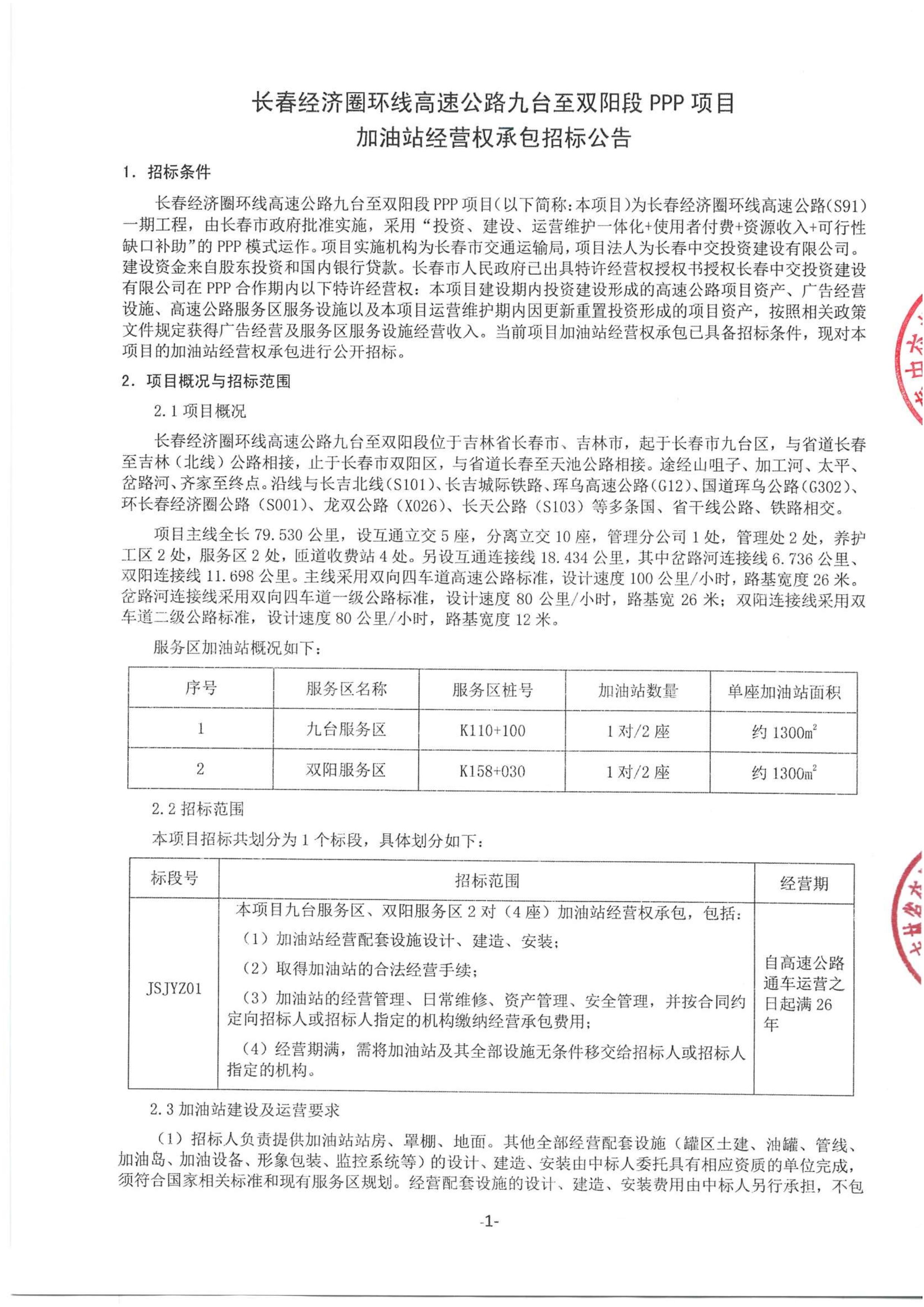 长春经济圈环线高速公路九台至双阳段PPP项目加油站经营权承包招标公告