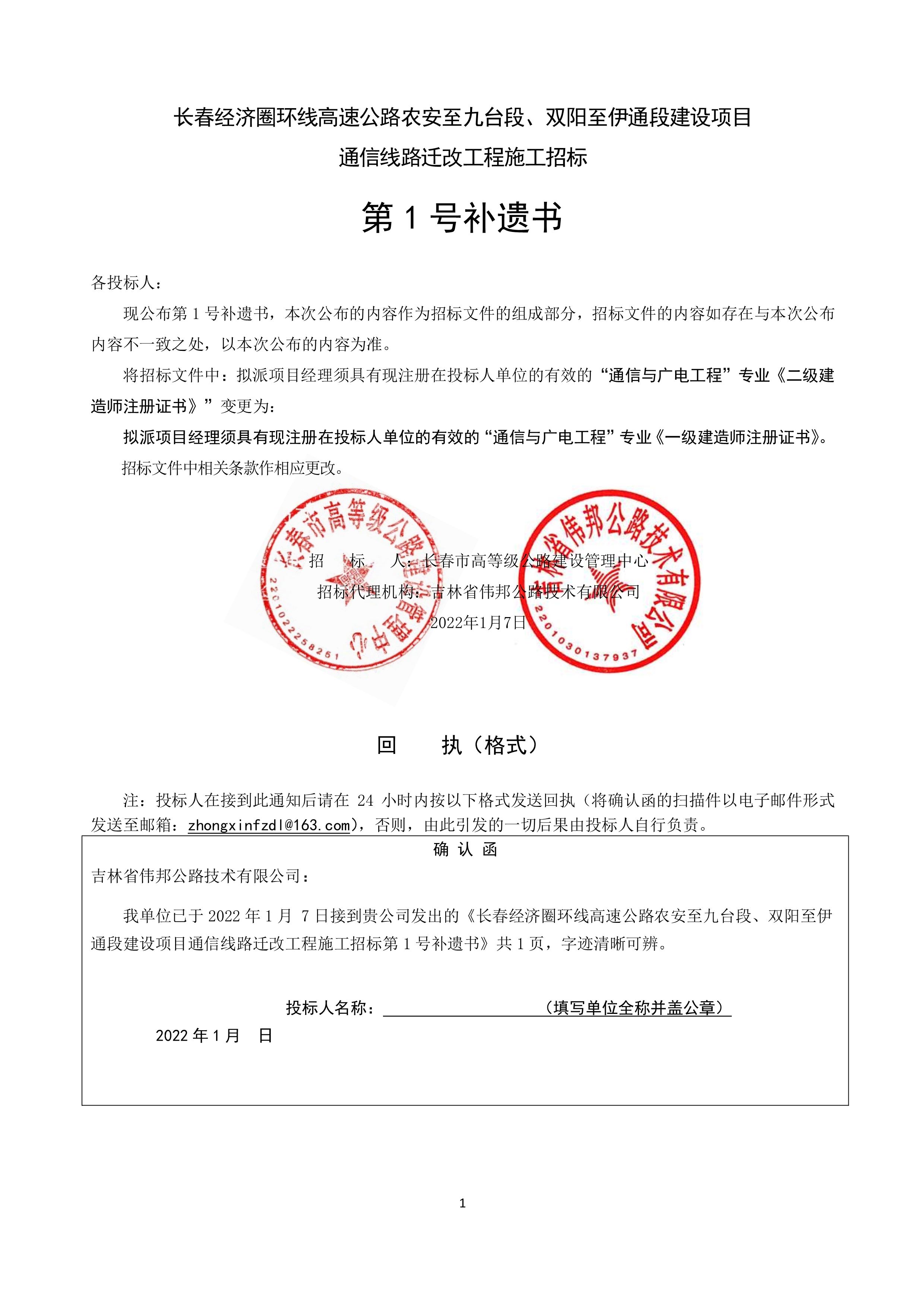 长春经济圈环线高速公路农安至九台段双阳至伊通段建设项目通信线路迁改工程施工招标第1号补遗书