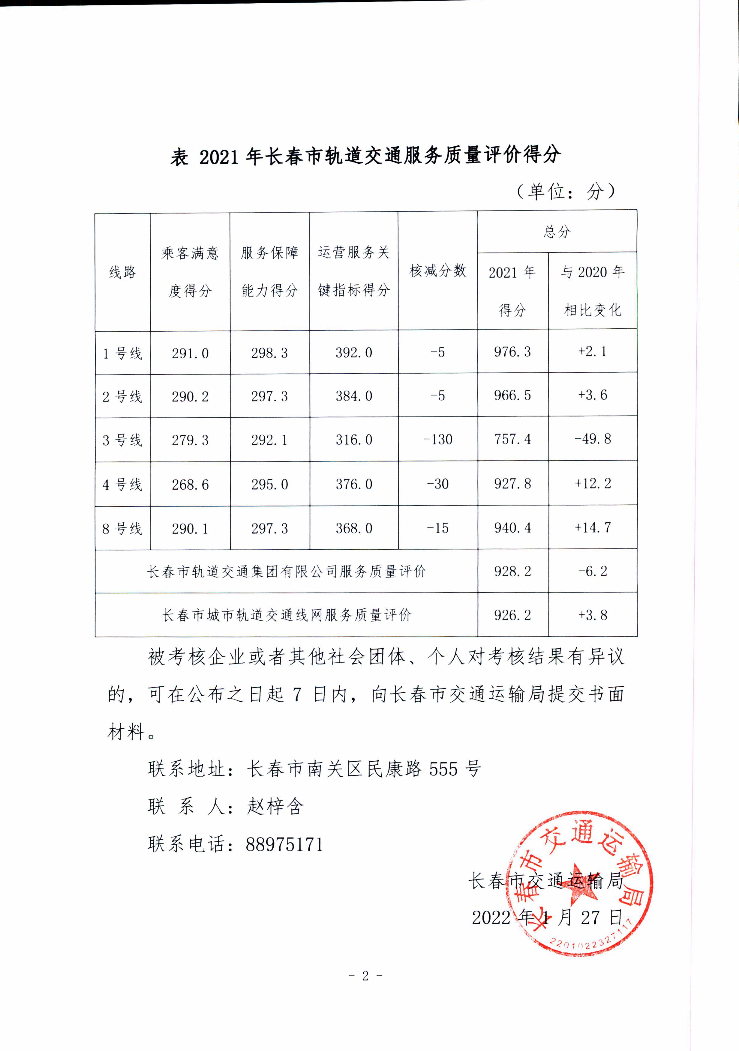 长春市2021年度城市轨道交通服务质量评价结果公示