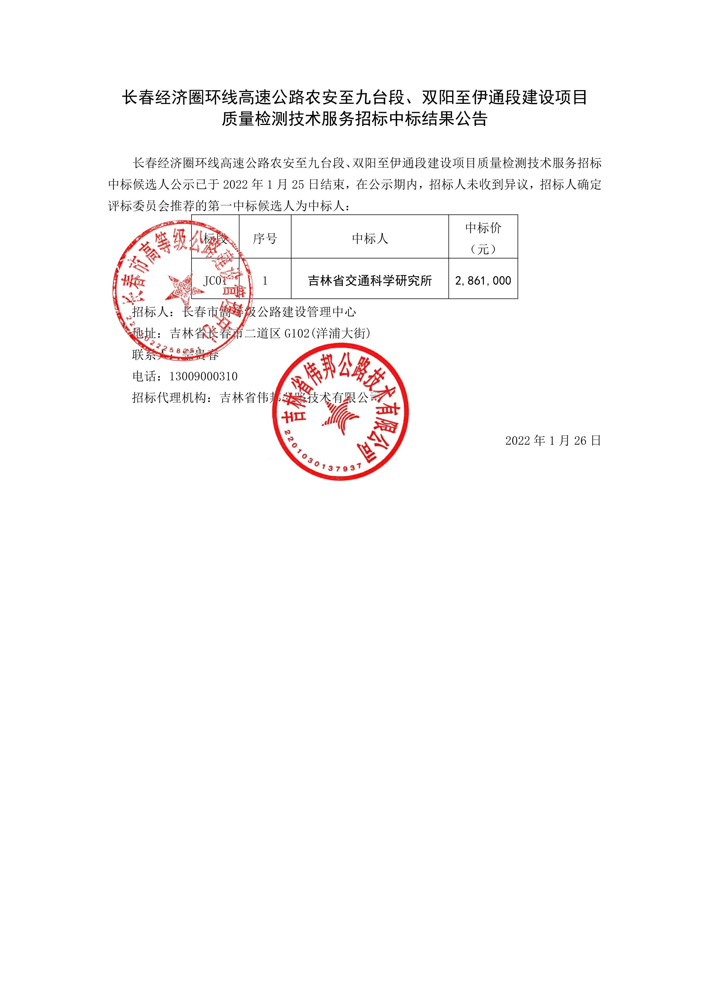 长春经济圈环线高速公路农安至九台段、双阳至伊通段建设项目质量检测技术服务招标中标结果公告