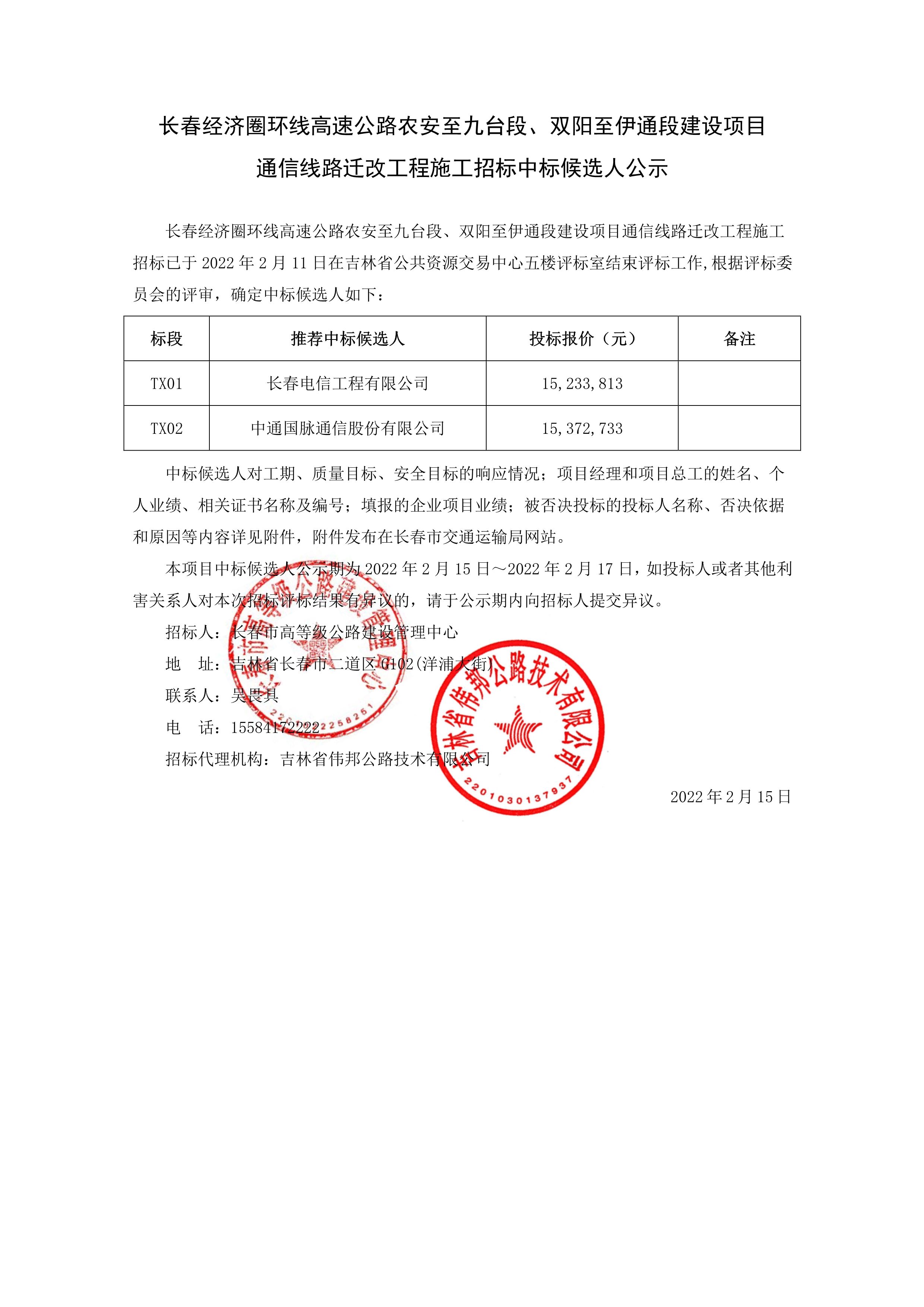 长春经济圈环线高速公路农安至九台段、双阳至伊通段建设项目通信线路迁改工程施工招标中标候选人公示