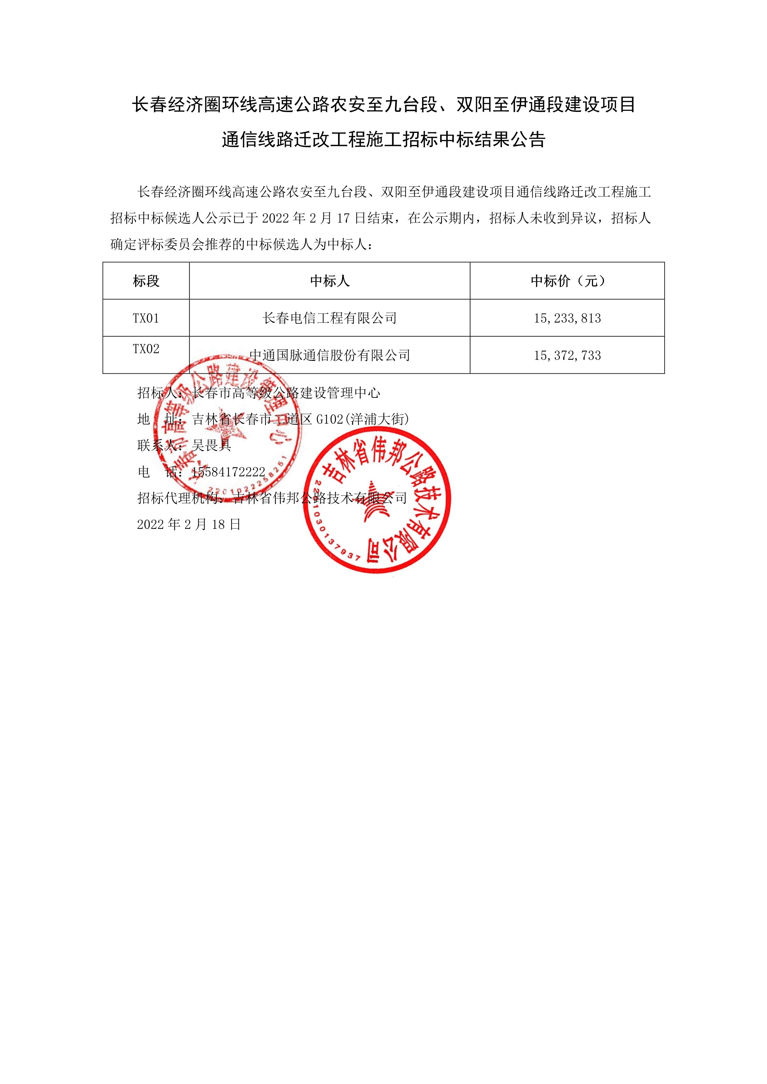 长春经济圈环线高速公路农安至九台段、双阳至伊通段建设项目通信线路迁改工程施工招标中标结果公告