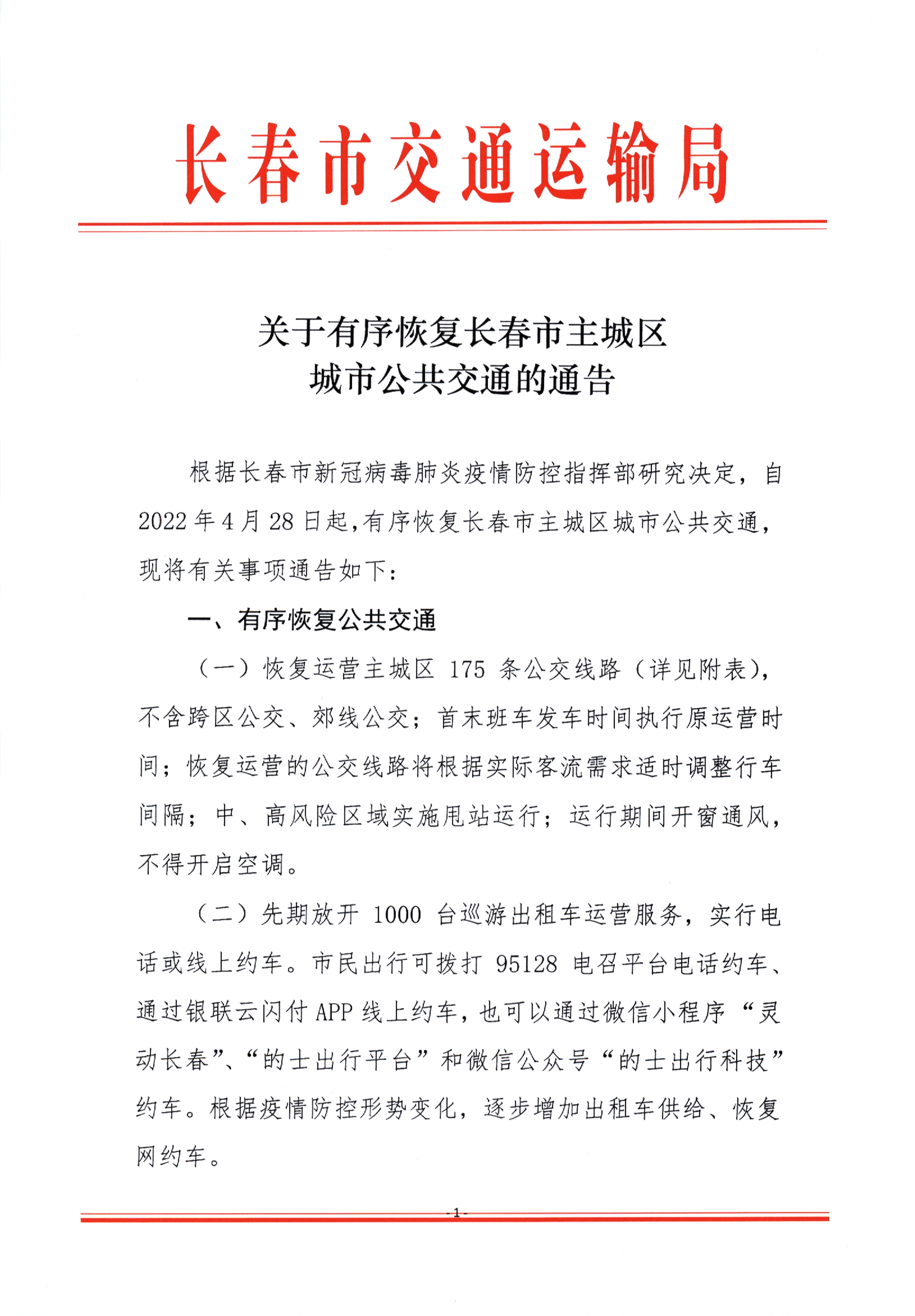 关于有序恢复长春市主城区城市公共交通的通告