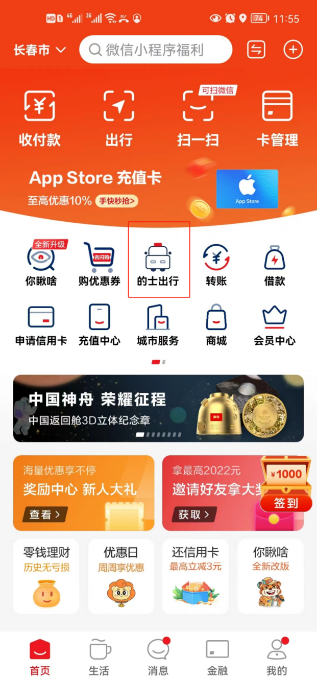 第一步,打开“银联云闪付”首页“的士出行”。