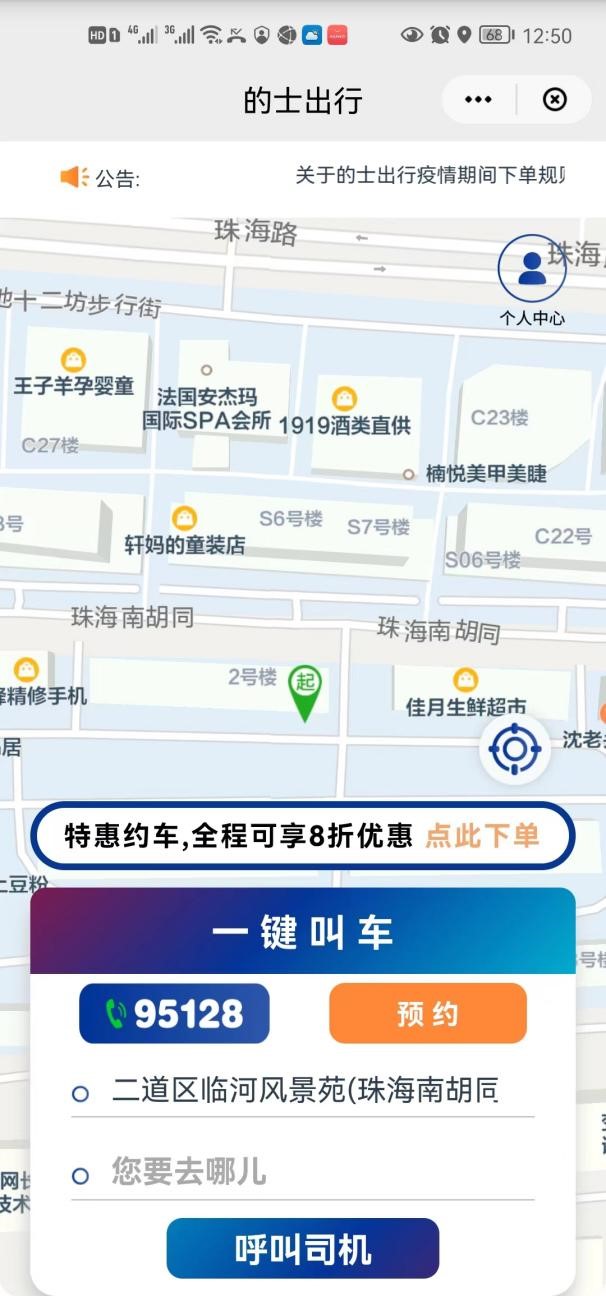 第二步,进入“的士出行”程序输入目的地,点击呼叫司机。