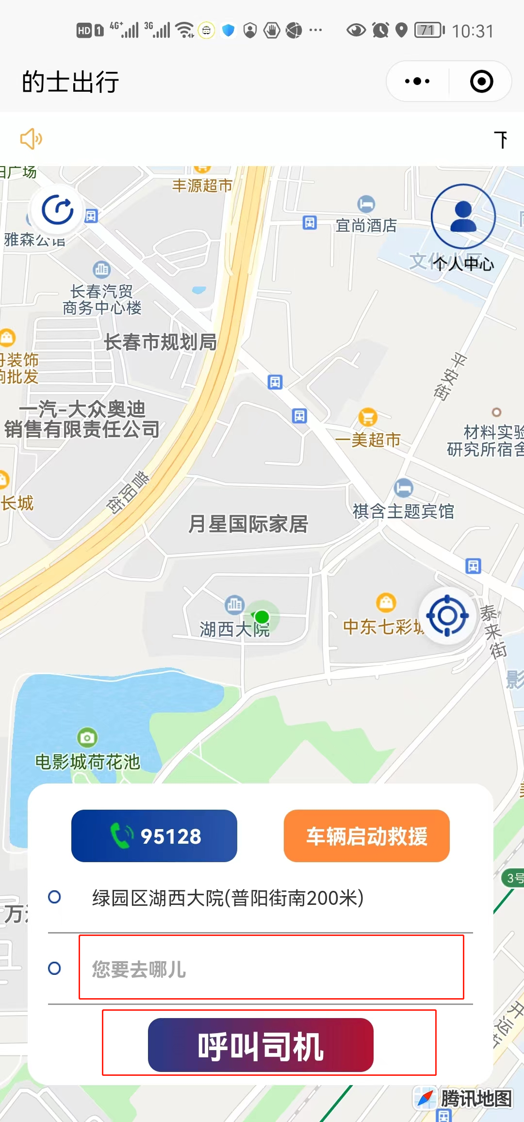 第二步,在“的士出行平台”程序内输入目的地,点击呼叫司机。