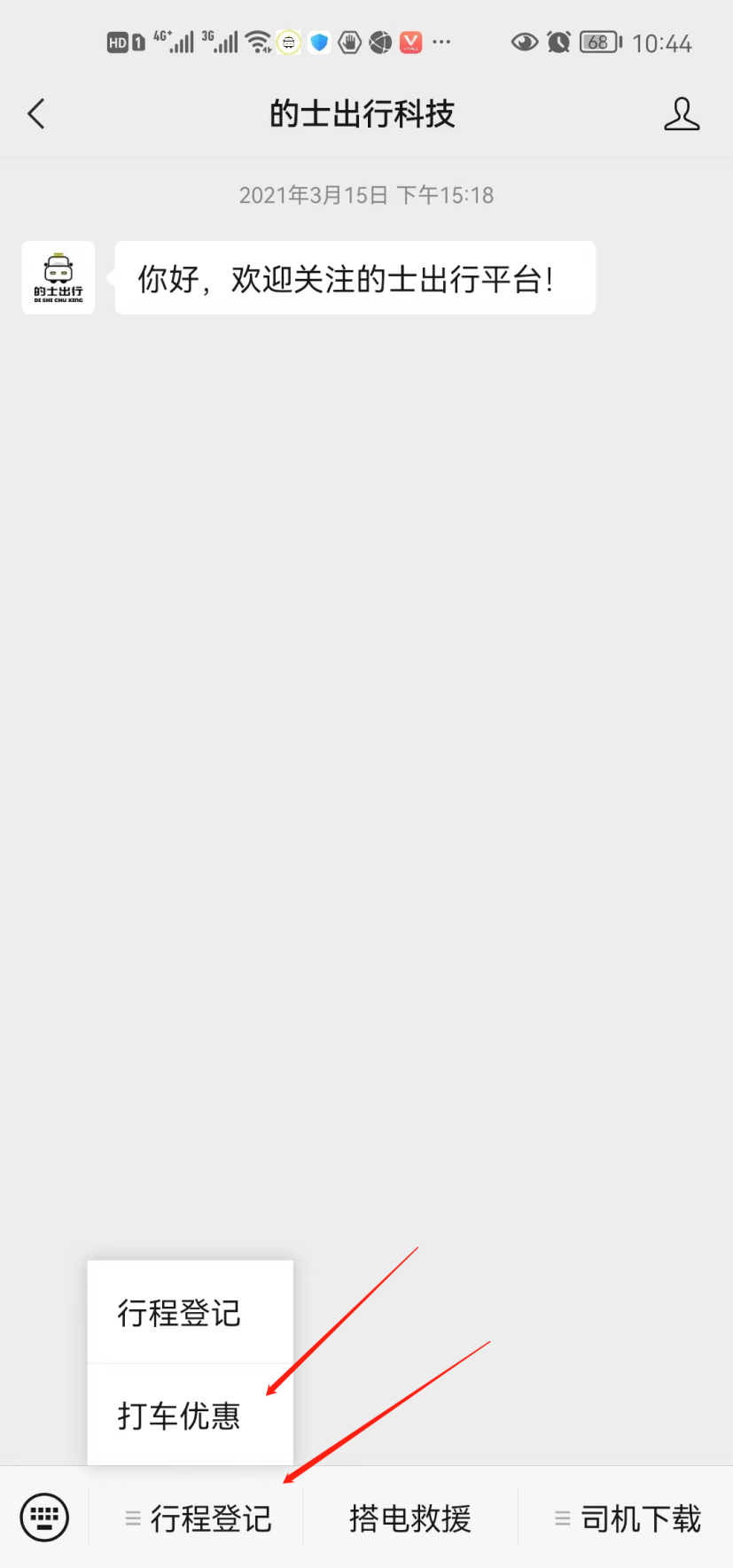 第二步,进入“的士出行科技”程序,点击下方菜单“行程登记”,选择“打车优惠”进入“的士出行平台”。