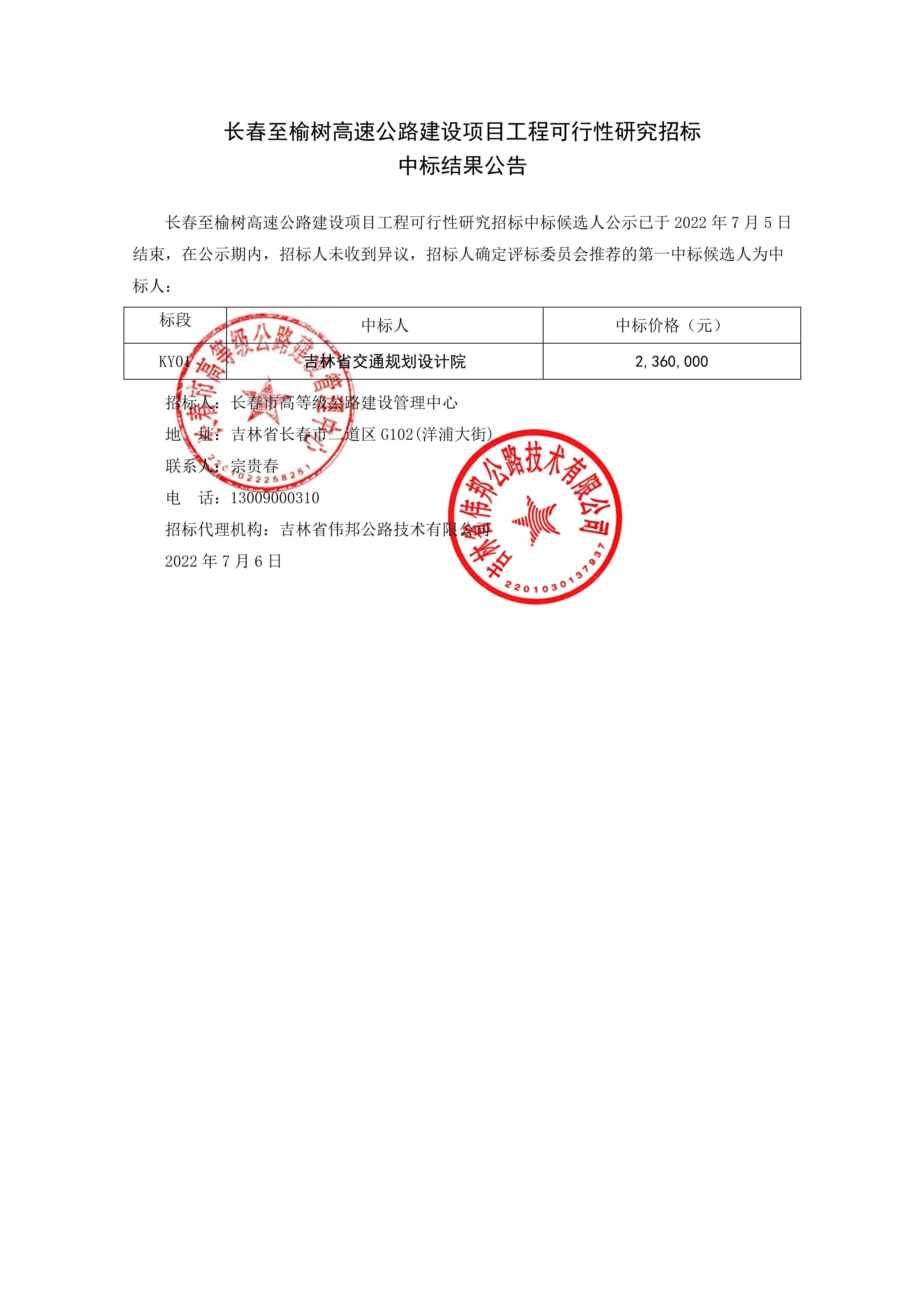 长春至榆树高速公路建设项目工程可行性研究招标中标结果公告