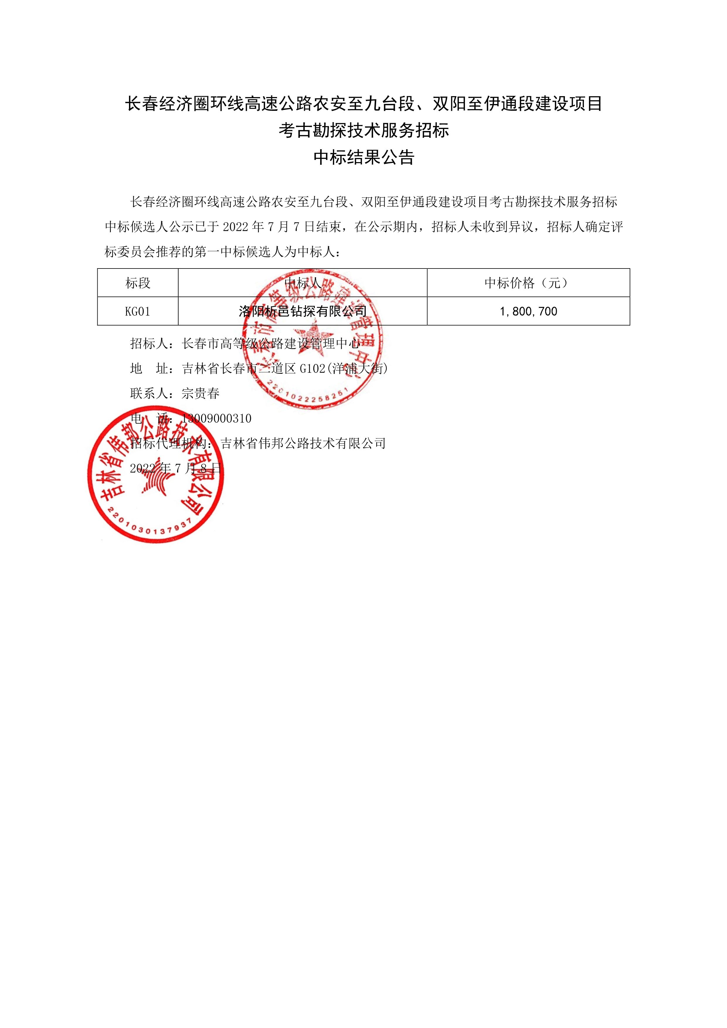 长春经济圈环线高速公路农安至九台段、双阳至伊通段建设项目考古勘探技术服务招标中标结果公告