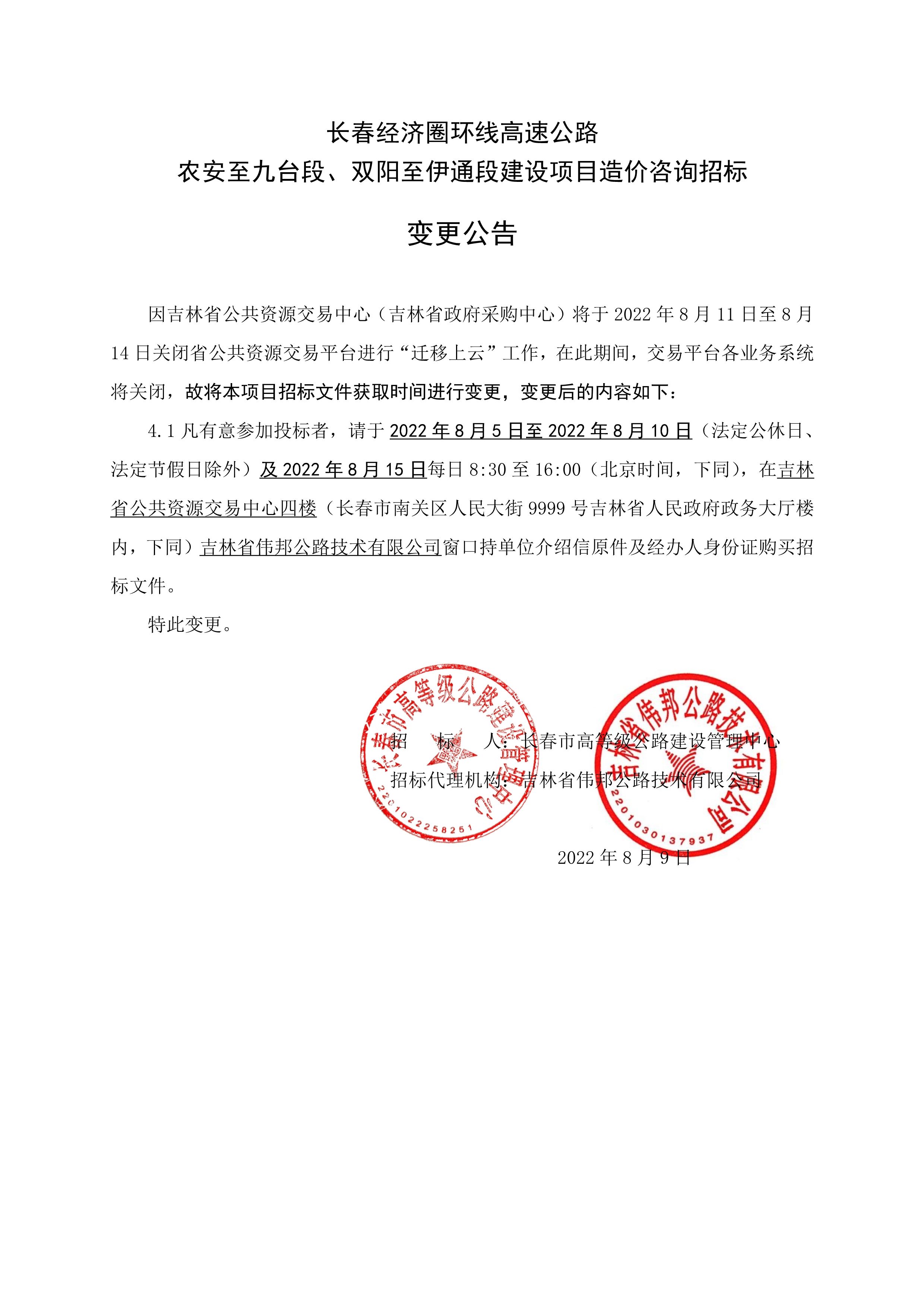 长春经济圈环线高速公路农安至九台段、双阳至伊通段建设项目造价咨询招标变更公告