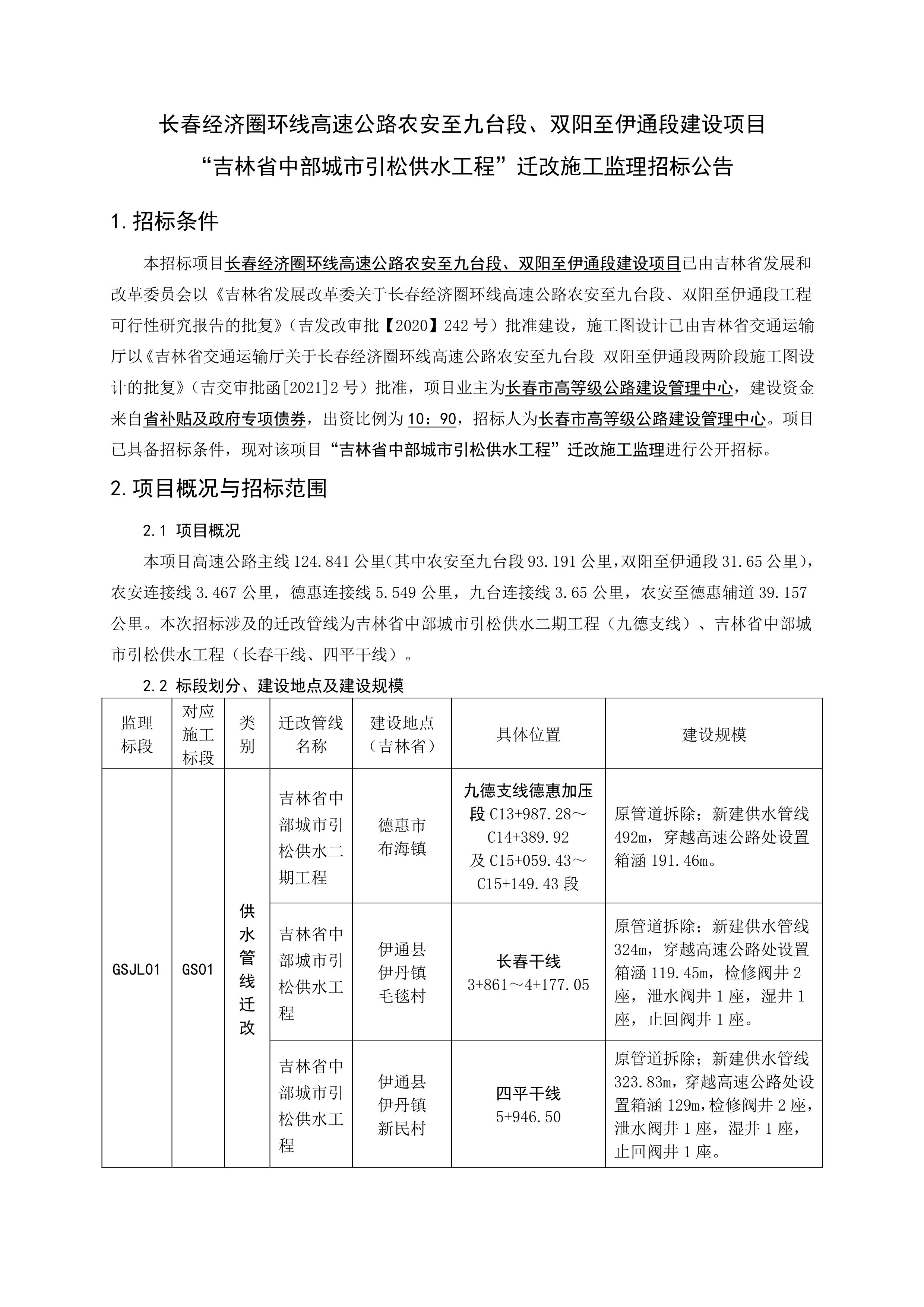 长春经济圈环线高速公路农安至九台段、双阳至伊通段建设项目“吉林省中部城市引松供水工程”迁改施工监理招标公告.pdf