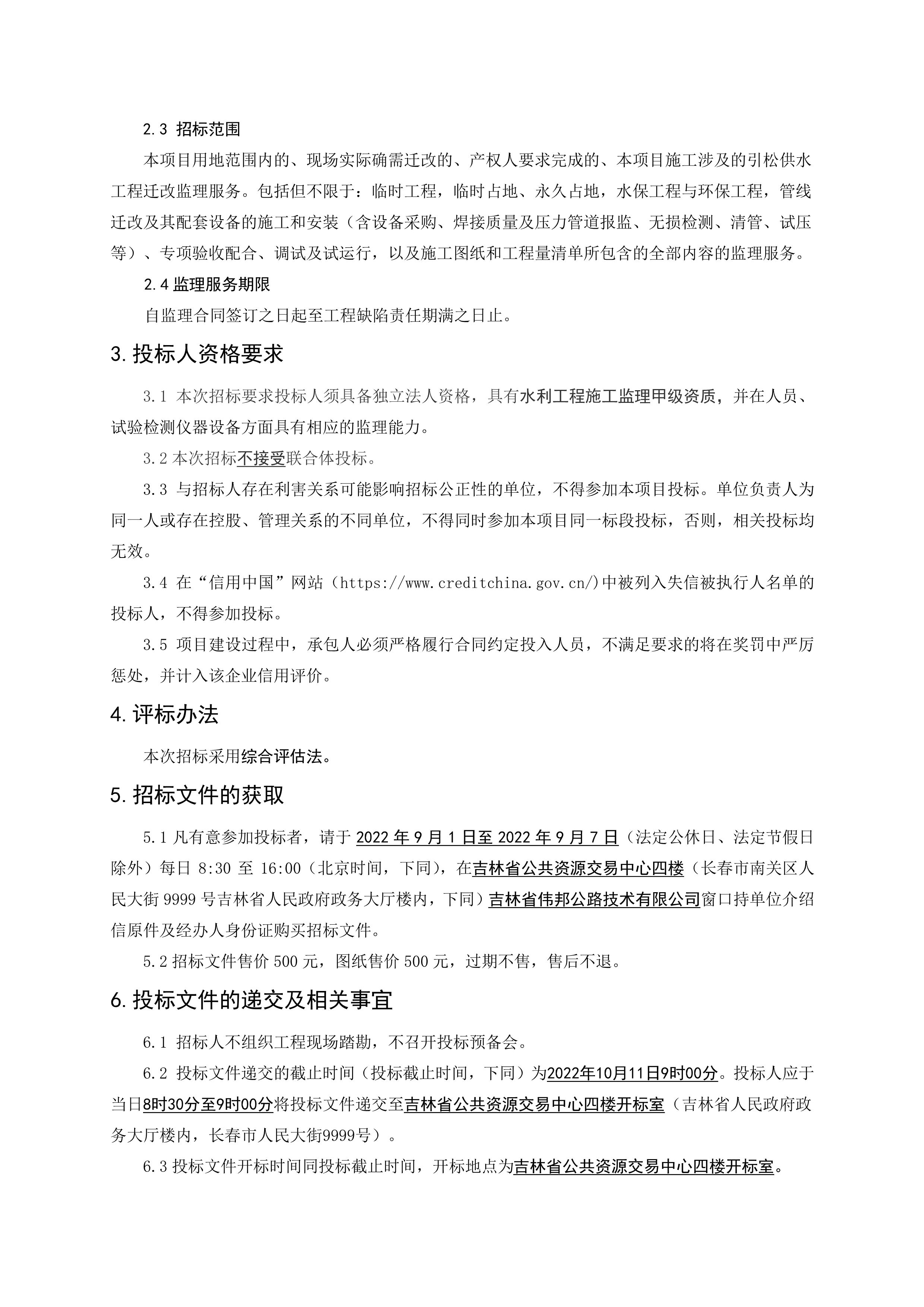 长春经济圈环线高速公路农安至九台段、双阳至伊通段建设项目“吉林省中部城市引松供水工程”迁改施工监理招标招标文件关键内容信息公开.pdf
