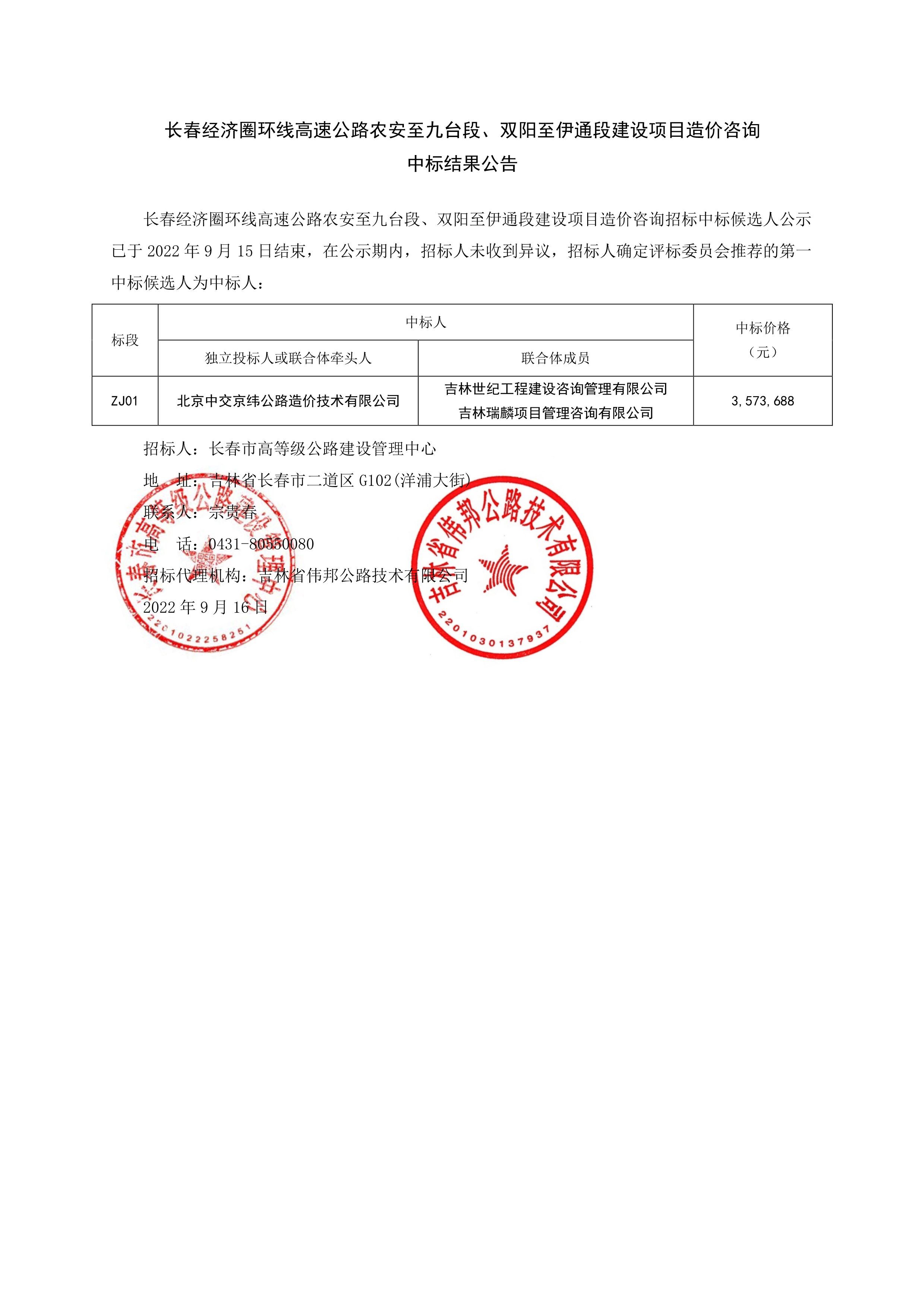 长春经济圈环线高速公路农安至九台段、双阳至伊通段建设项目造价咨询中标结果公告.pdf