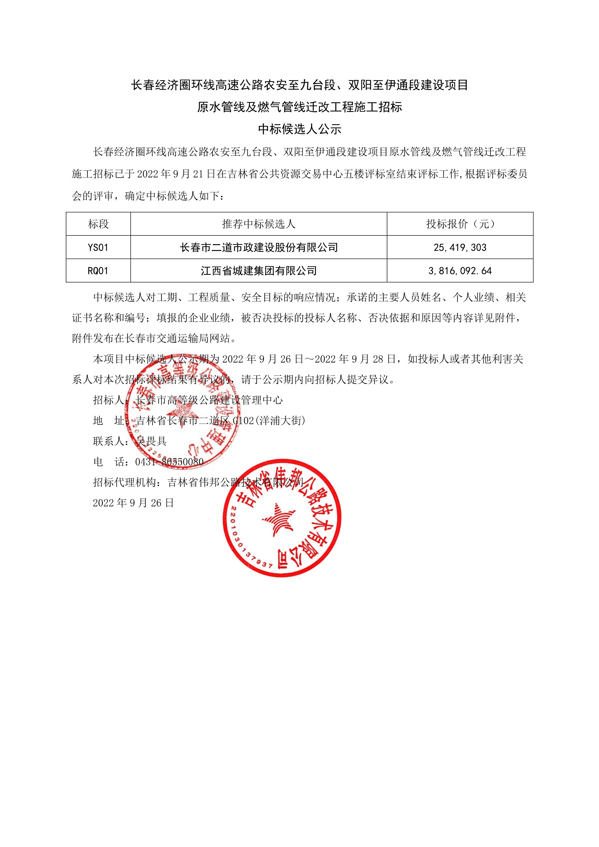 长春经济圈环线高速公路农安至九台段、双阳至伊通段建设项目原水管线及燃气管线迁改工程施工招标中标候选人公示