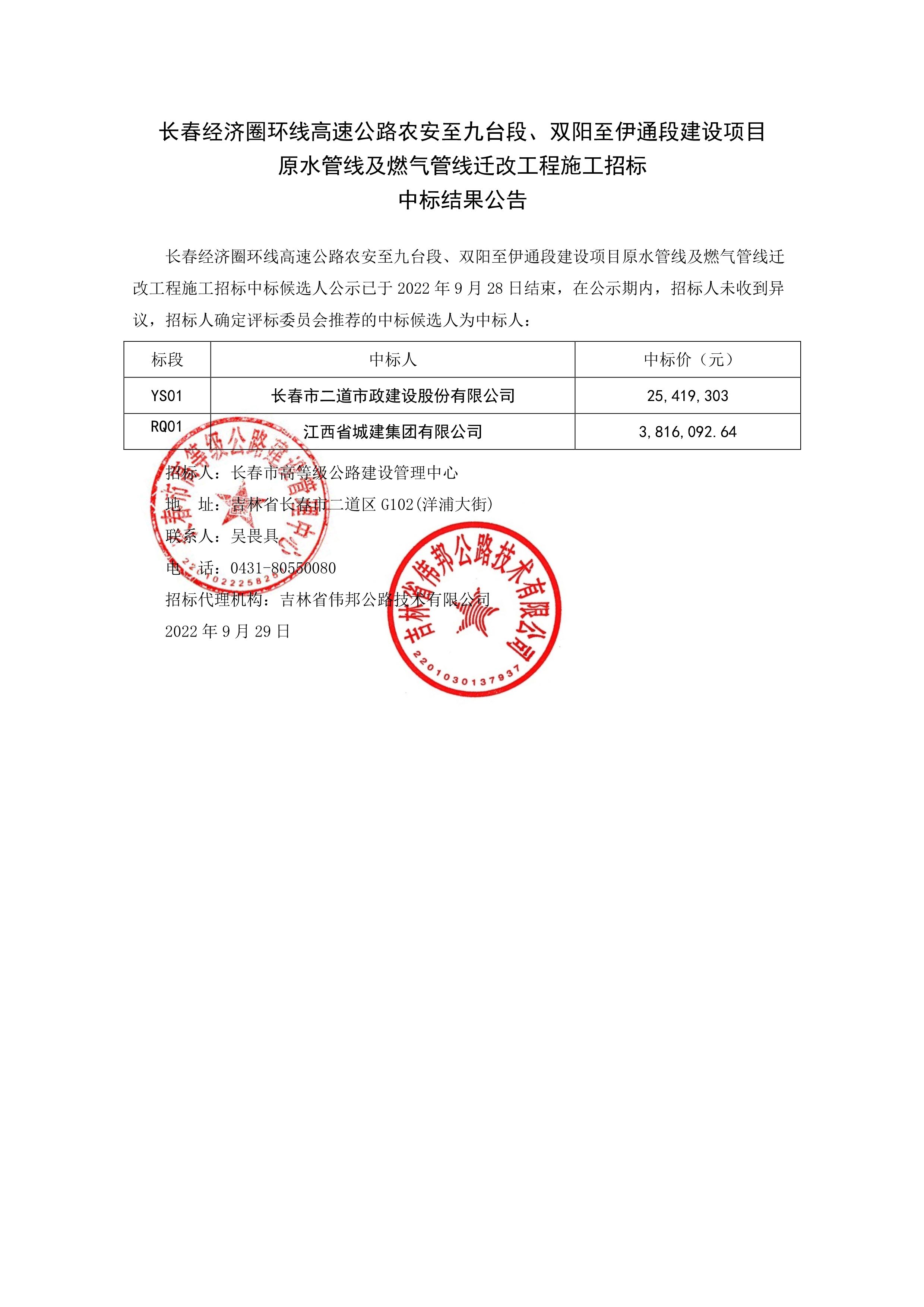 长春经济圈环线高速公路农安至九台段、双阳至伊通段建设项目原水管线及燃气管线迁改工程施工招标中标结果公告