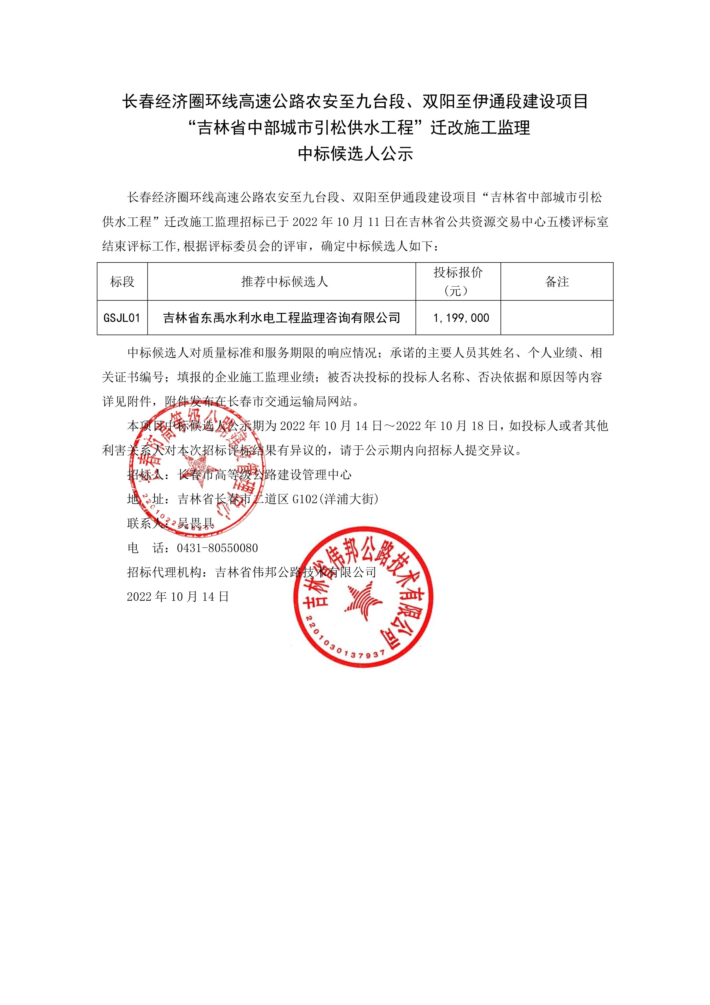 长春经济圈环线高速公路农安至九台段、双阳至伊通段建设项目“吉林省中部城市引松供水工程”迁改施工监理中标候选人公示