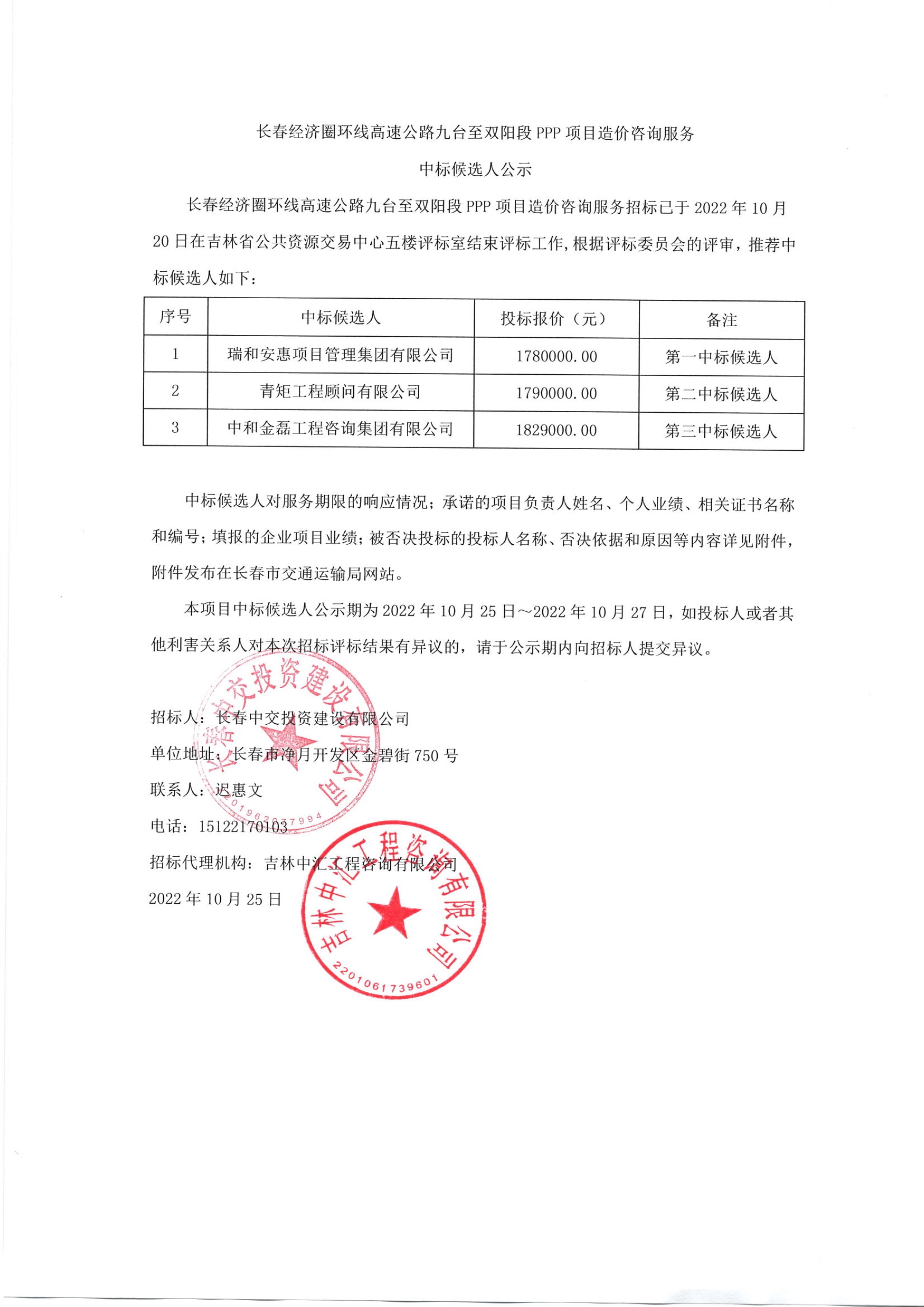 长春经济圈环线高速公路九台至双阳段PPP项目造价咨询服务中标候选人公示