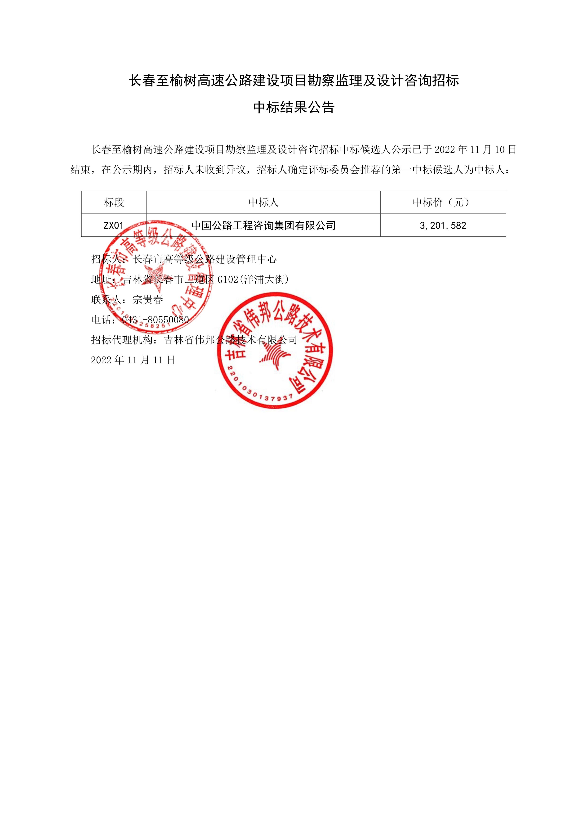 长春至榆树高速公路建设项目勘察监理及设计咨询招标中标结果公告