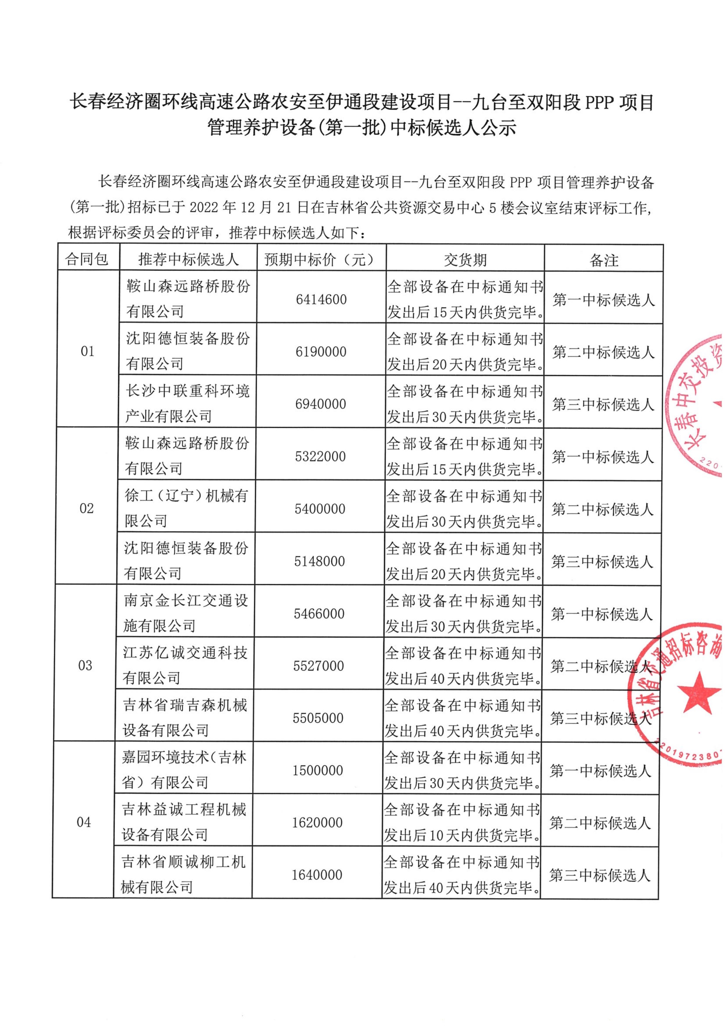 长春经济圈环线高速公路农安至伊通段建设项目-九台至双阳段PPP项目管理养护设备(第一批)中标候选人公示