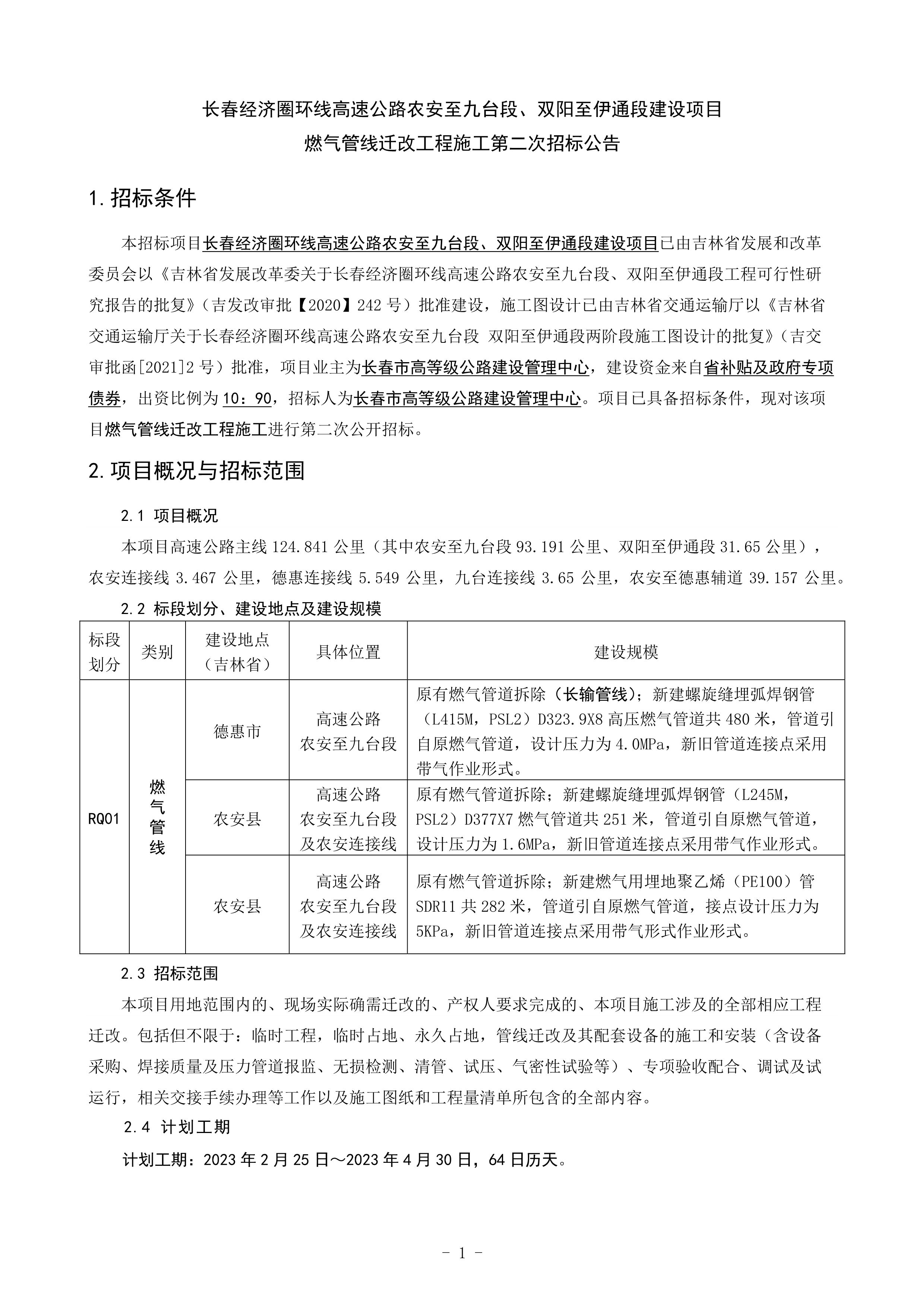长春经济圈环线高速公路农安至九台段、双阳至伊通段建设项目燃气管线迁改工程施工第二次招标招标公告.pdf