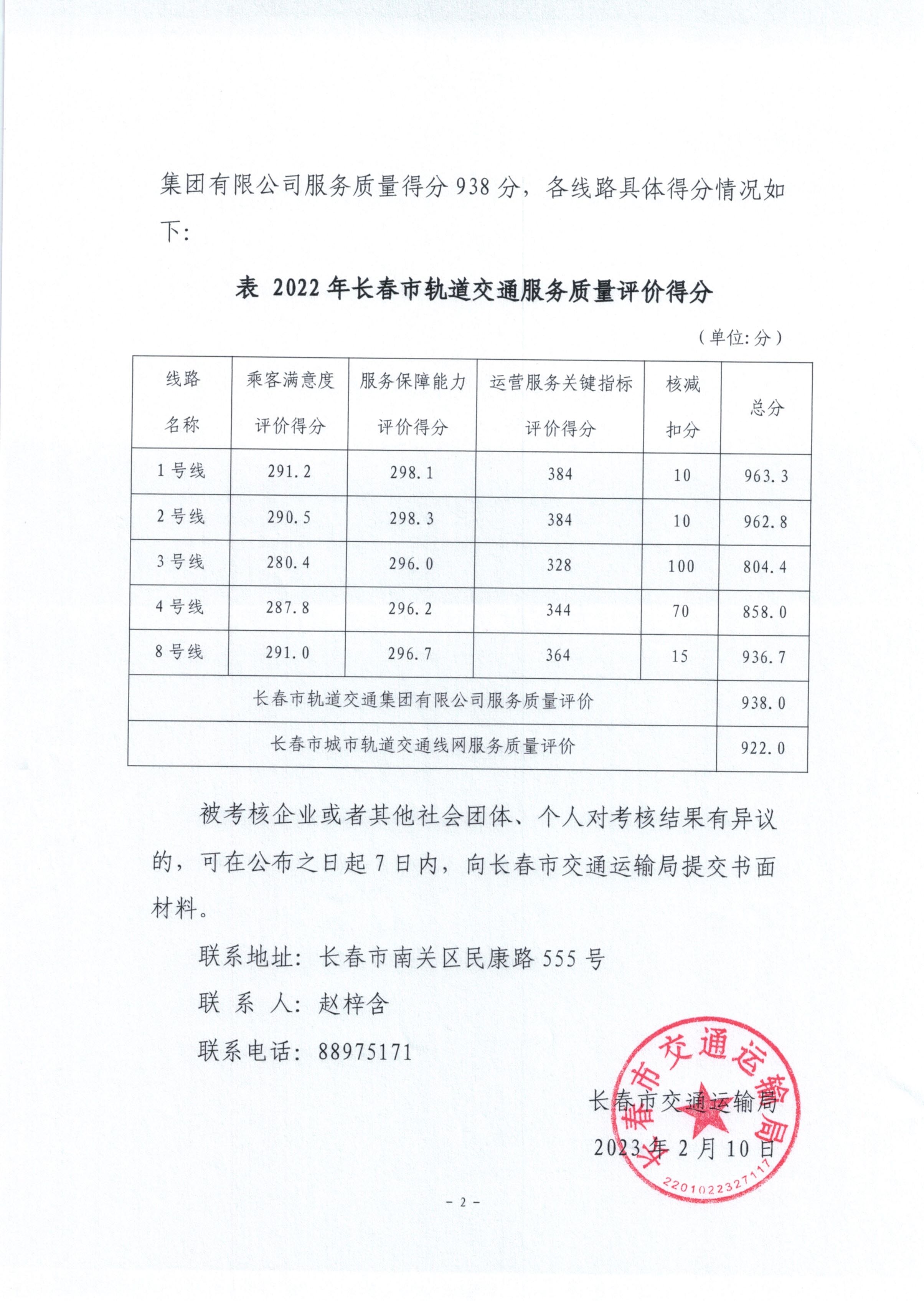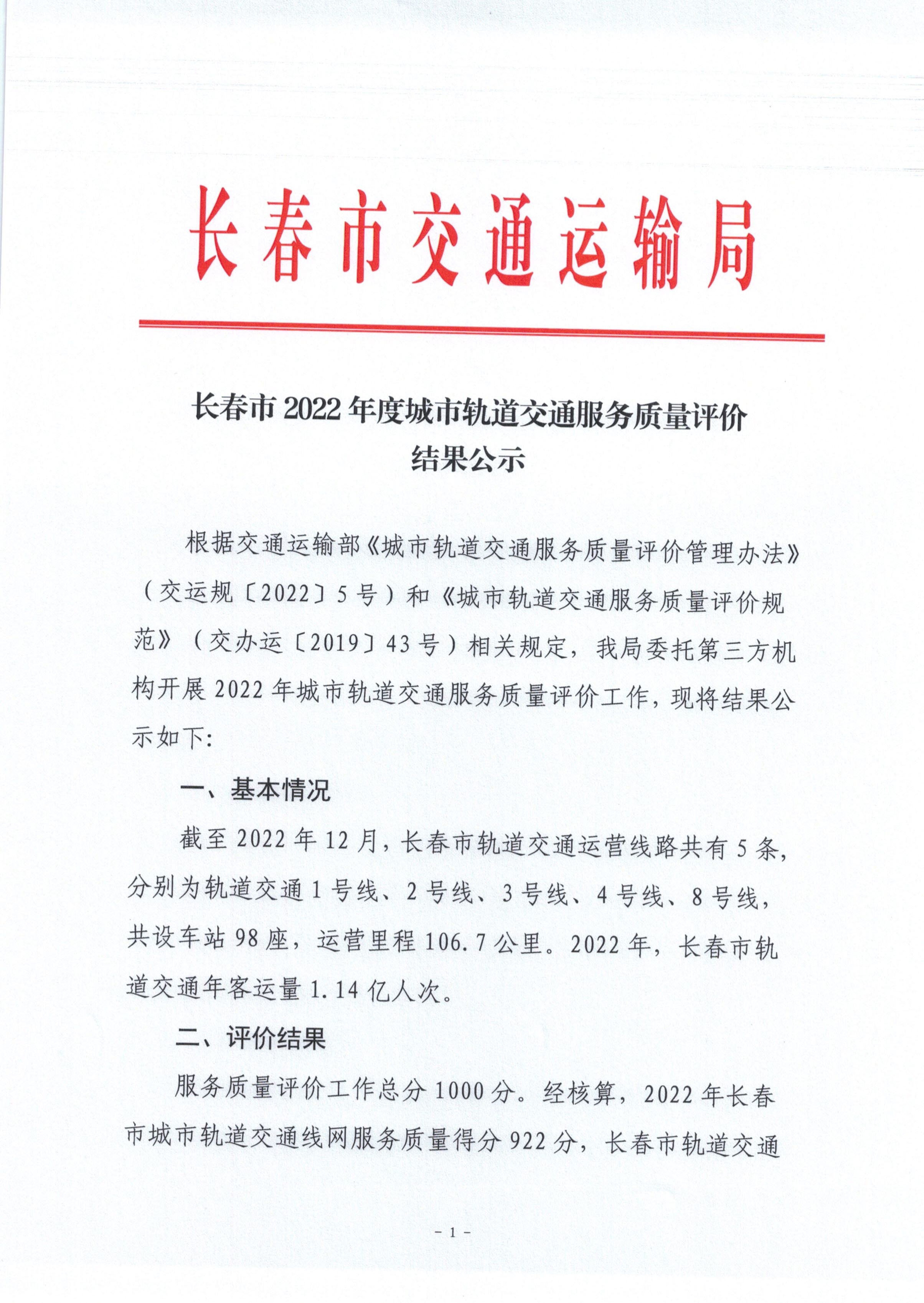 长春市2022年度城市轨道交通服务质量评价结果公示