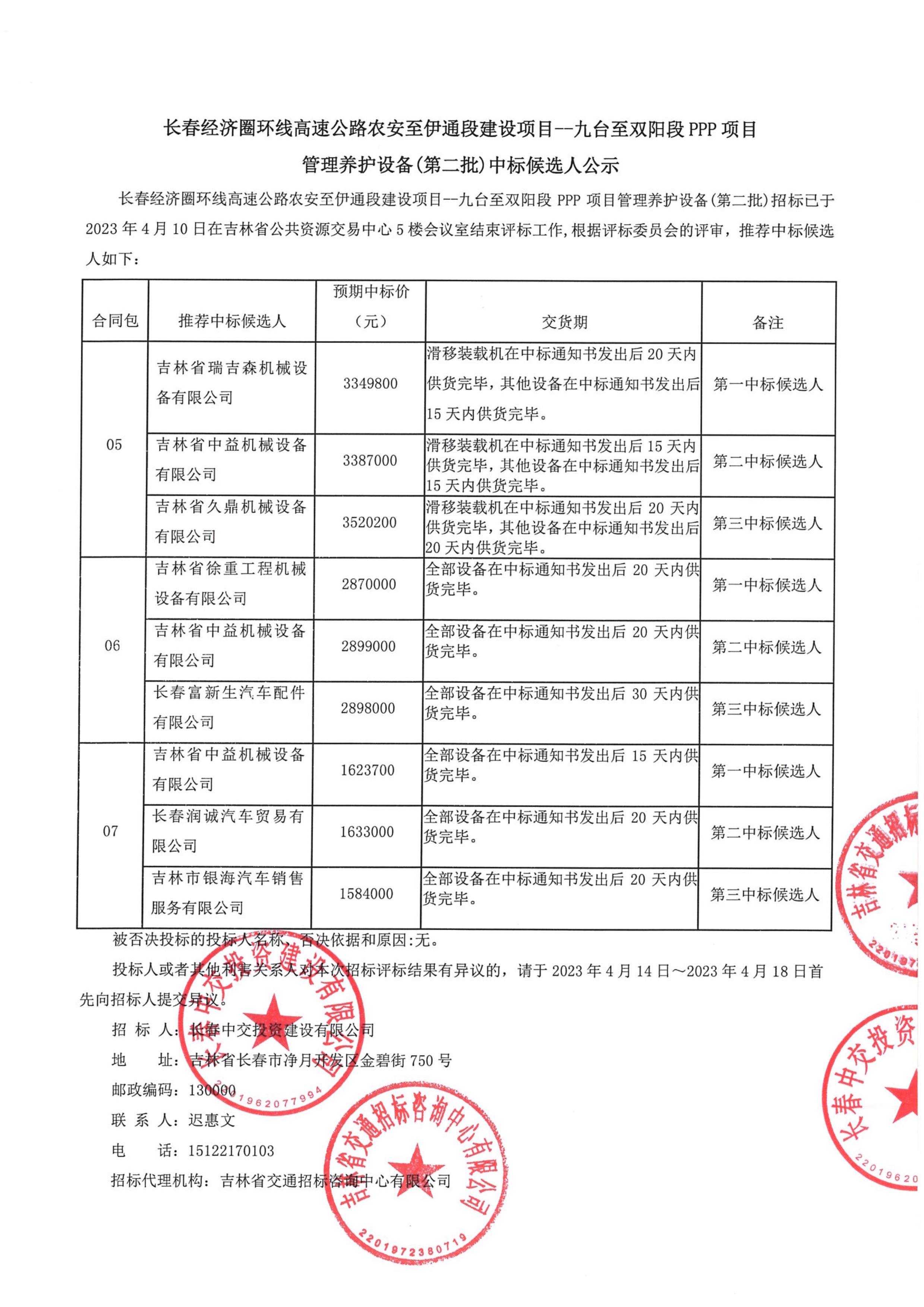 长春经济圈环线高速公路农安至伊通段建设项目——九台至双阳段PPP项目管理养护设备(第二批)中标候选人公示