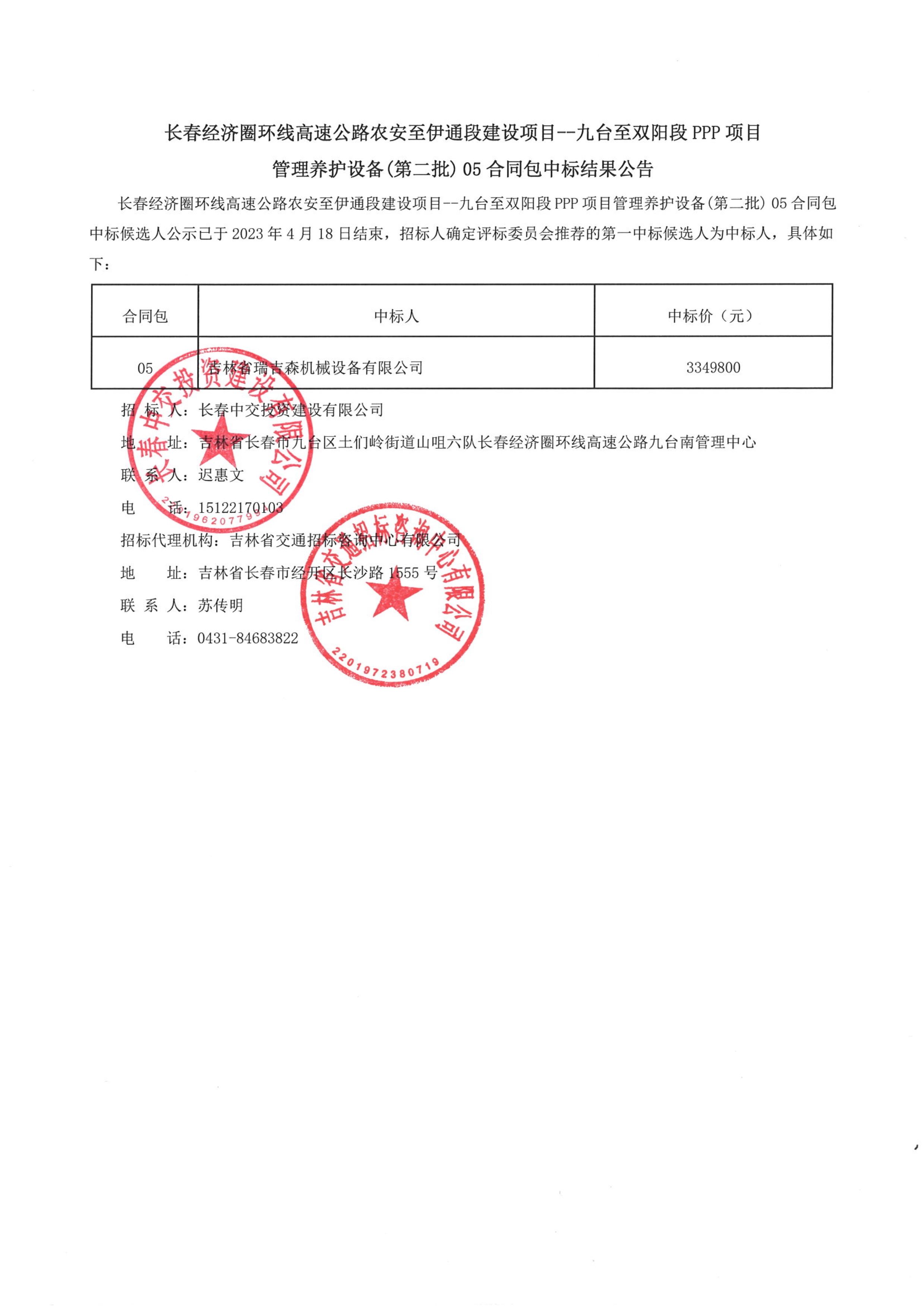 长春经济圈环线高速公路农安至伊通段建设项目--九台至双阳段PPP项目管理养护设备(第二批) 05、06合同包中标结果公告