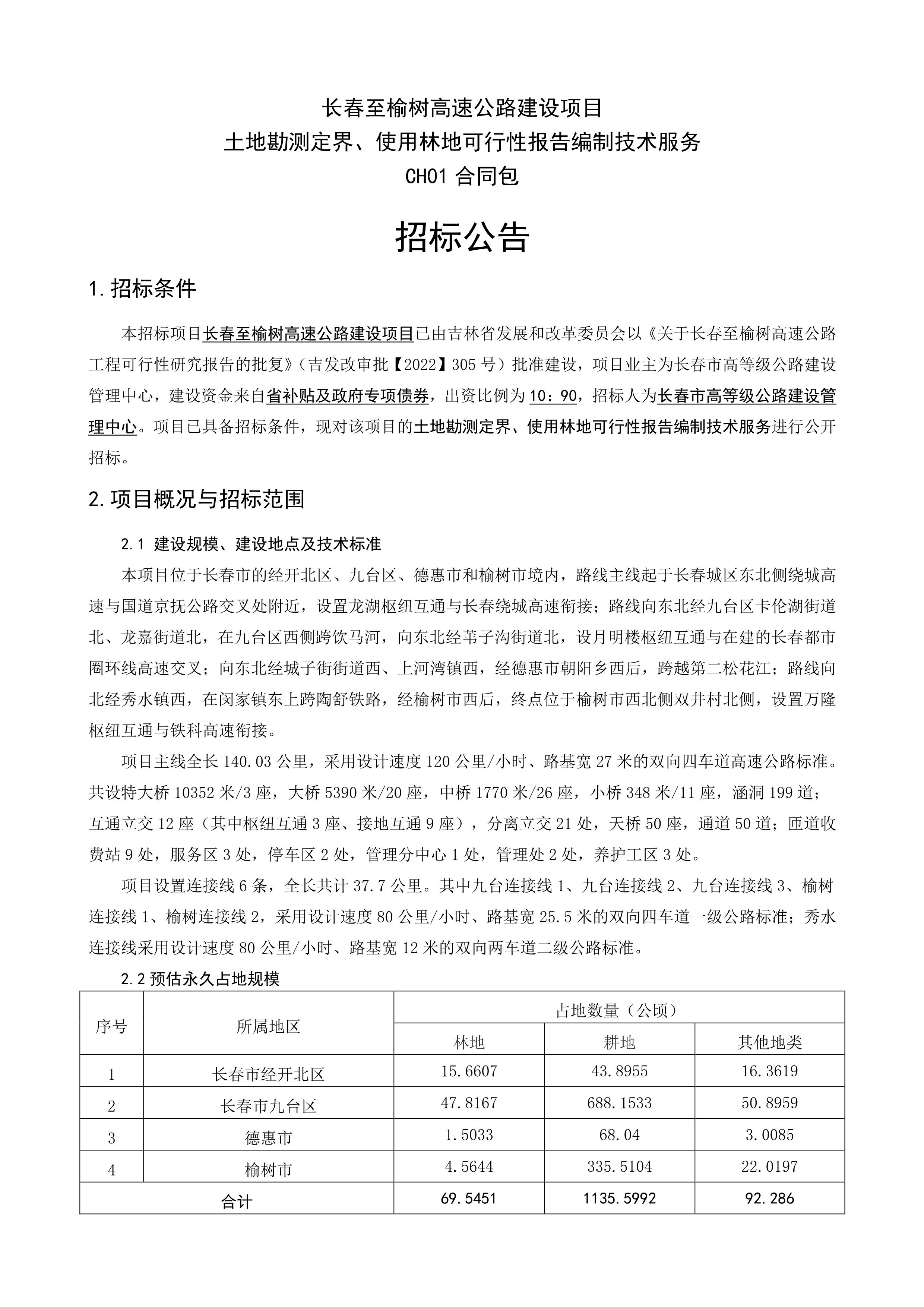 长春至榆树高速公路建设项目土地勘测定界、使用林地可行性报告编制技术服务CH01合同包招标公告.pdf