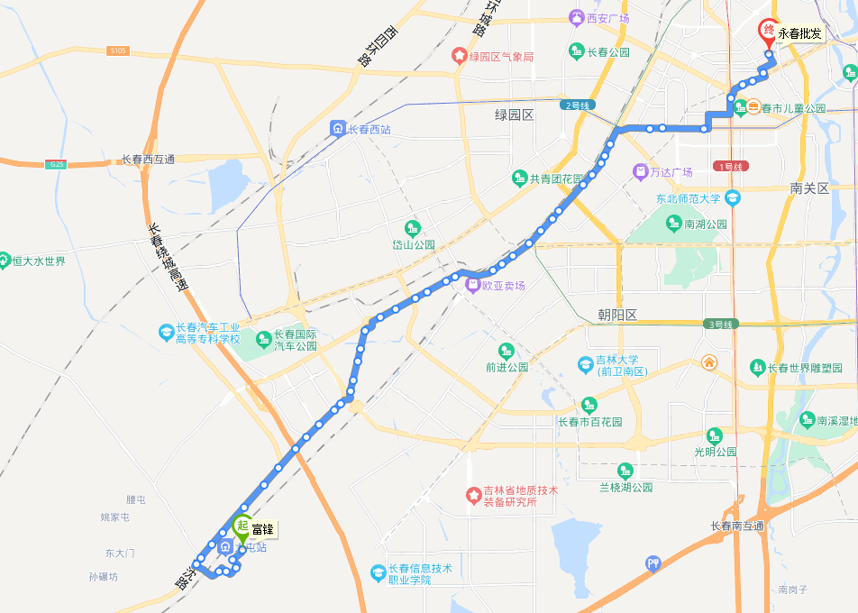 线路情况:该线路由长春公交集团经营,由工农广场始发,途经繁荣路、芳草街,终到公交南部枢纽,线路总长11公里,车隔10分钟。