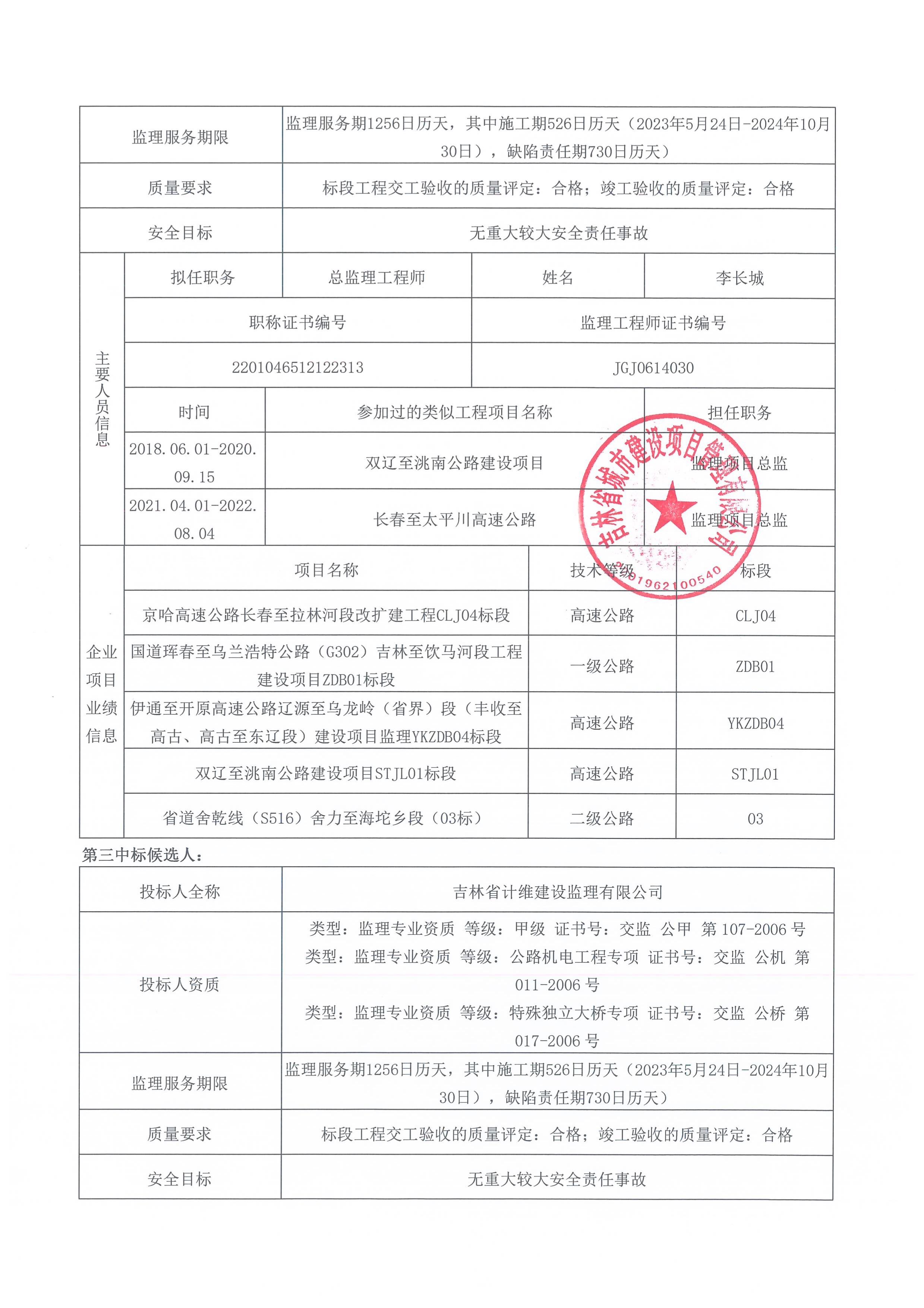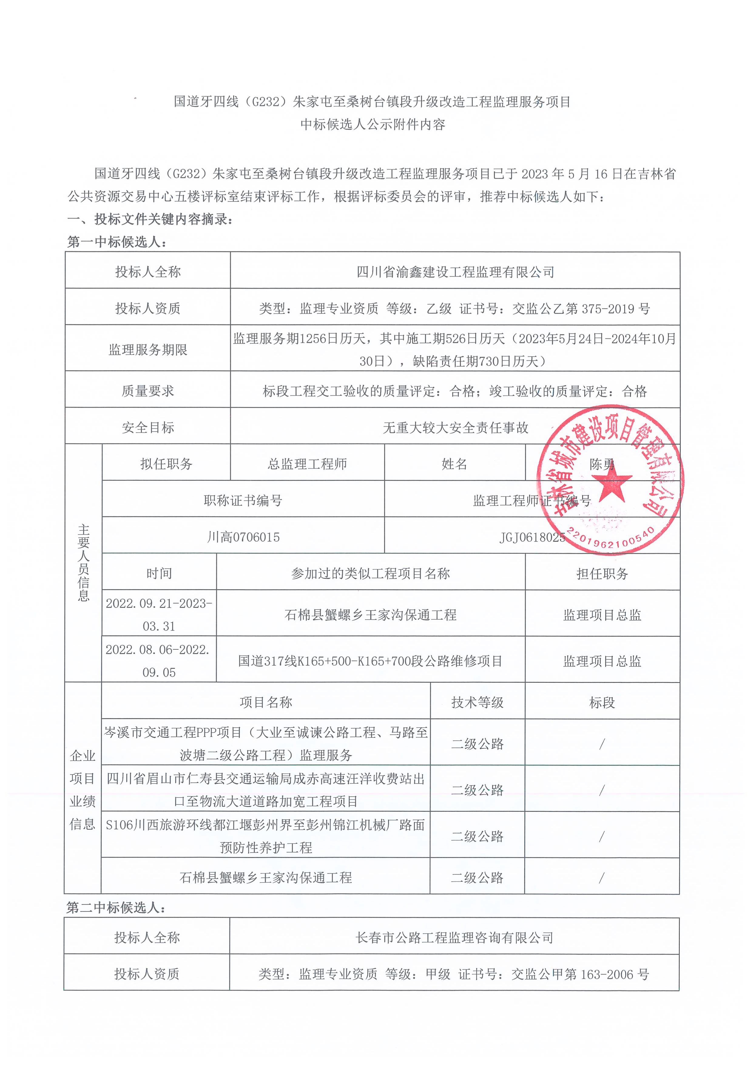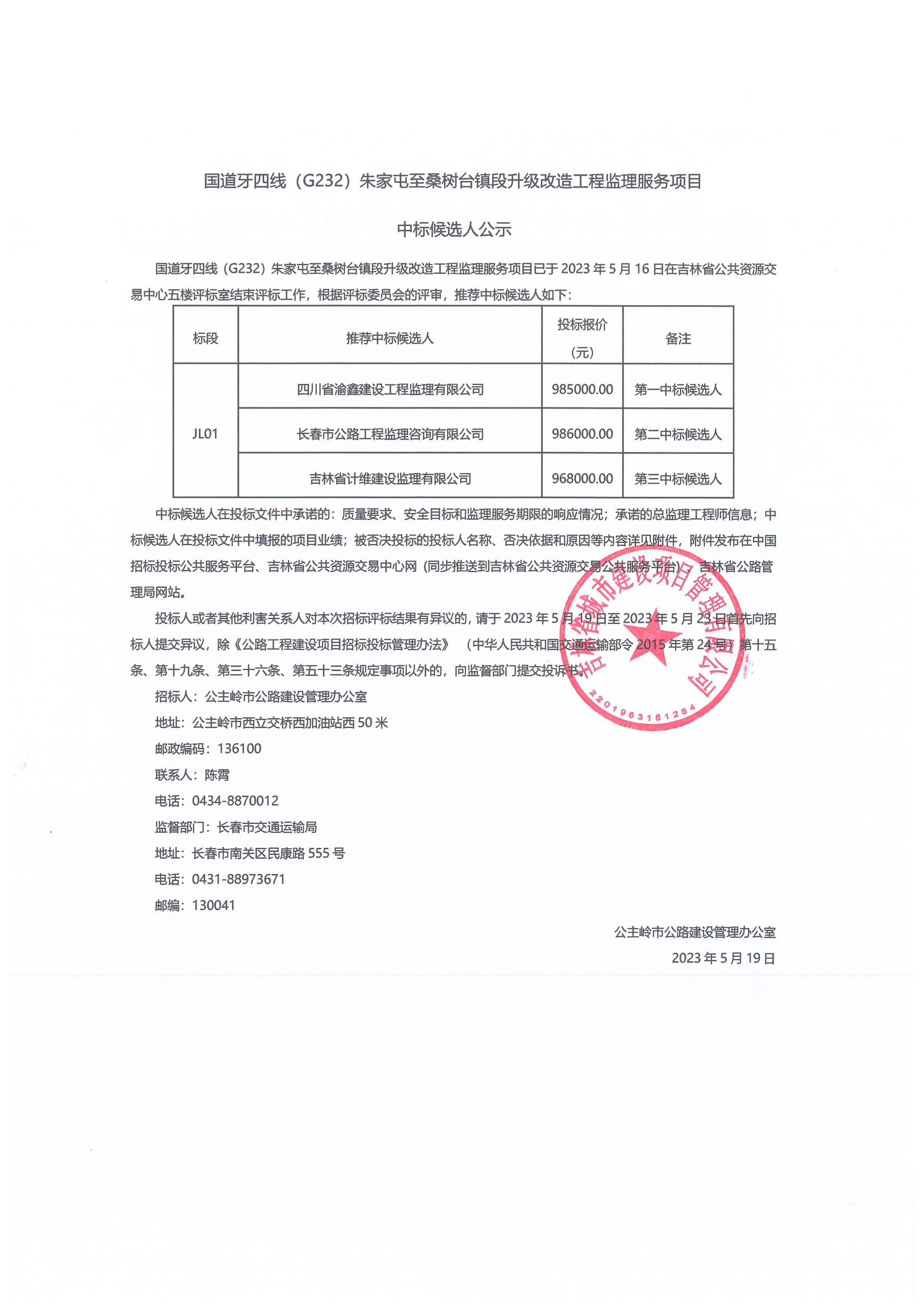 国道牙四线(G232)朱家屯至桑树台镇段升级改造工程监理服务项目中标候选人公示