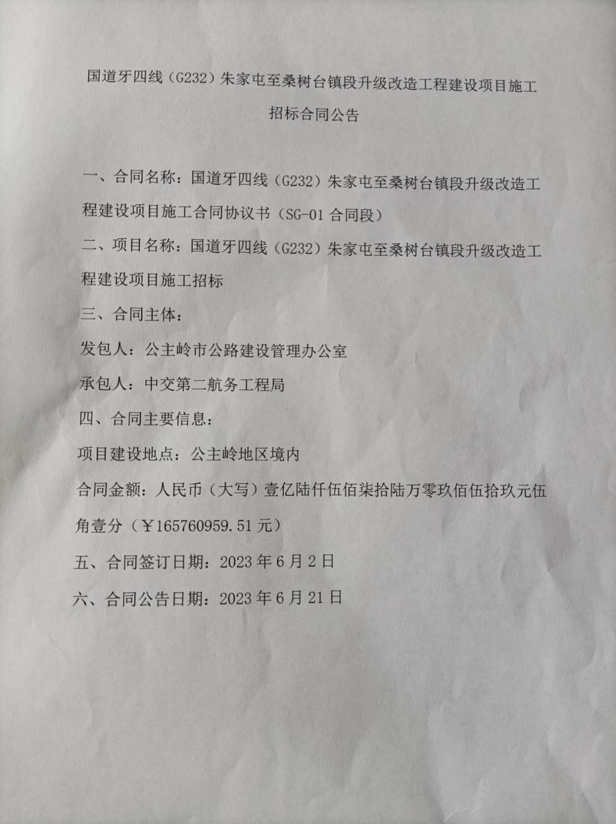 国道牙四线(G232)朱家屯至桑树台镇段升级改造工程建设项目施工招标合同公告