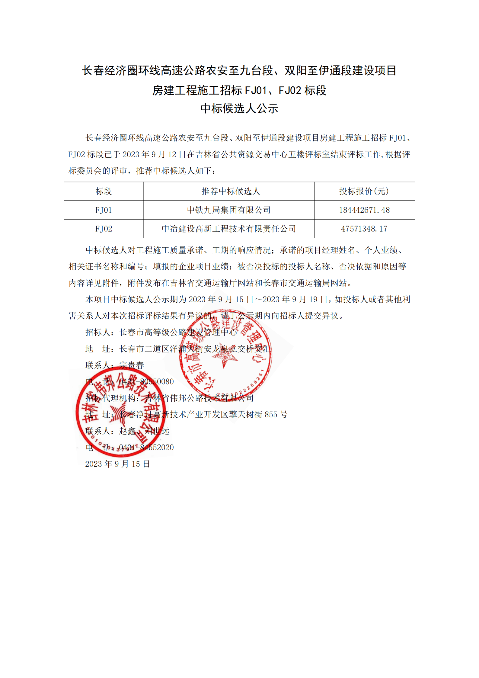 长春经济圈环线高速公路农安至九台段、双阳至伊通段建设项目房建工程施工招标FJ01、FJ02 标段中标候选人公示