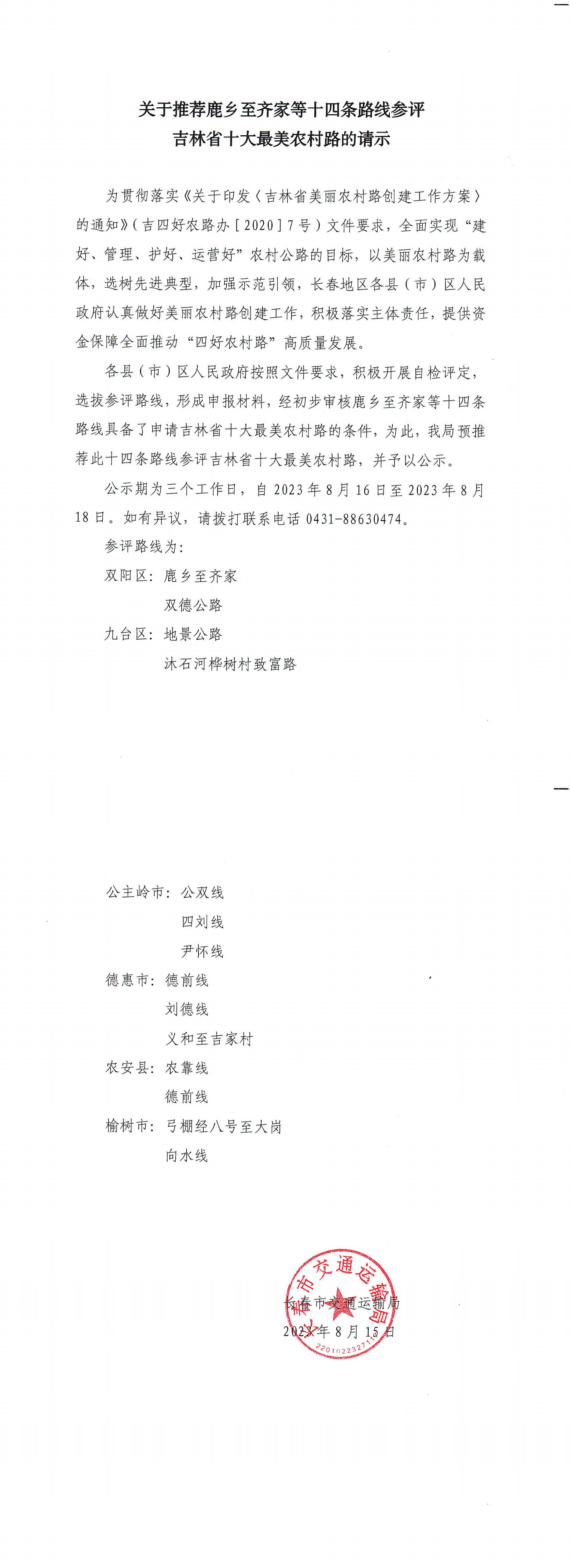 关于推荐鹿乡至齐家等十四条路线参评吉林省十大最美农村路的请示