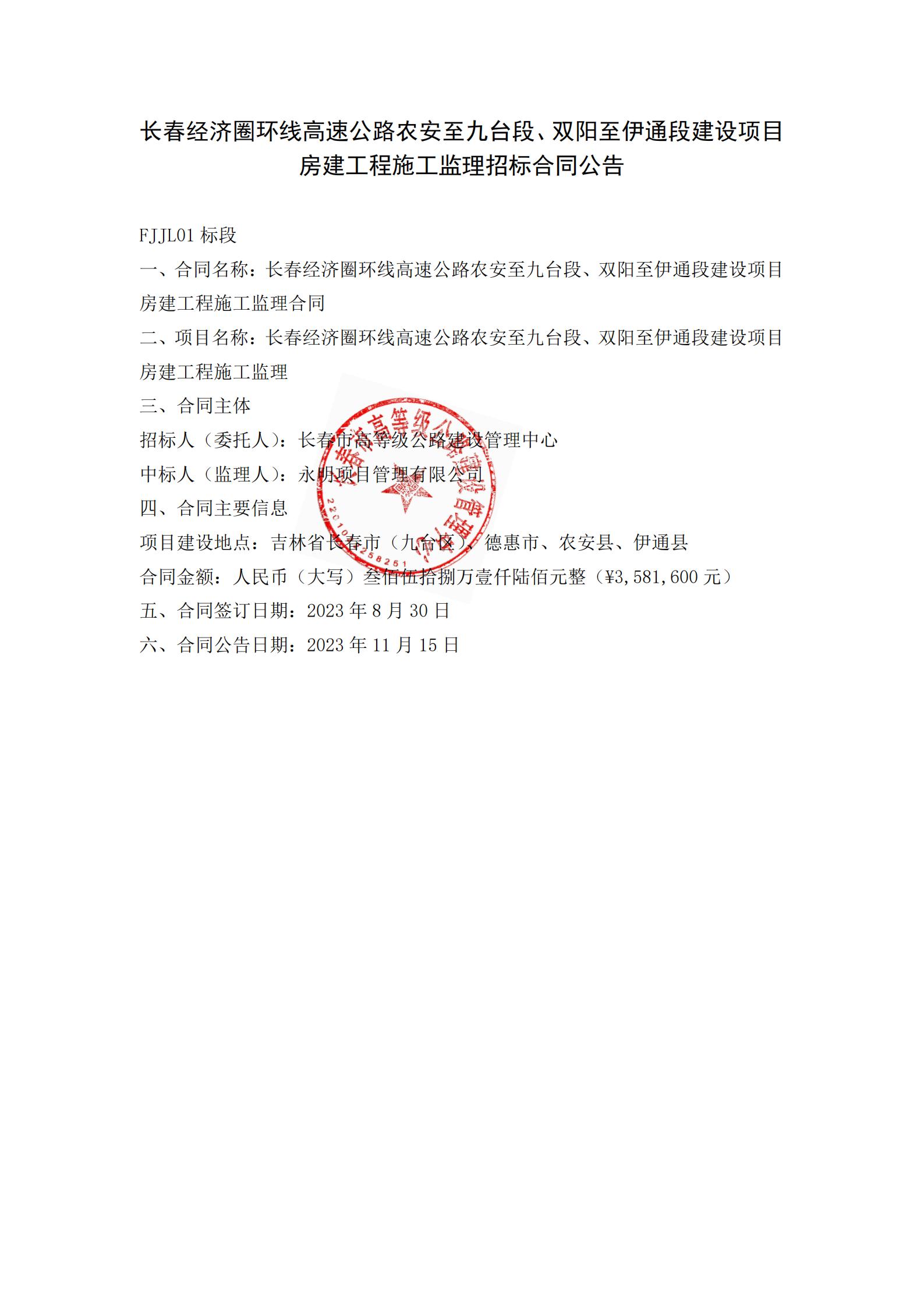 长春经济圈环线高速公路农安至九台段、双阳至伊通段建设项目房建工程施工监理招标合同公告