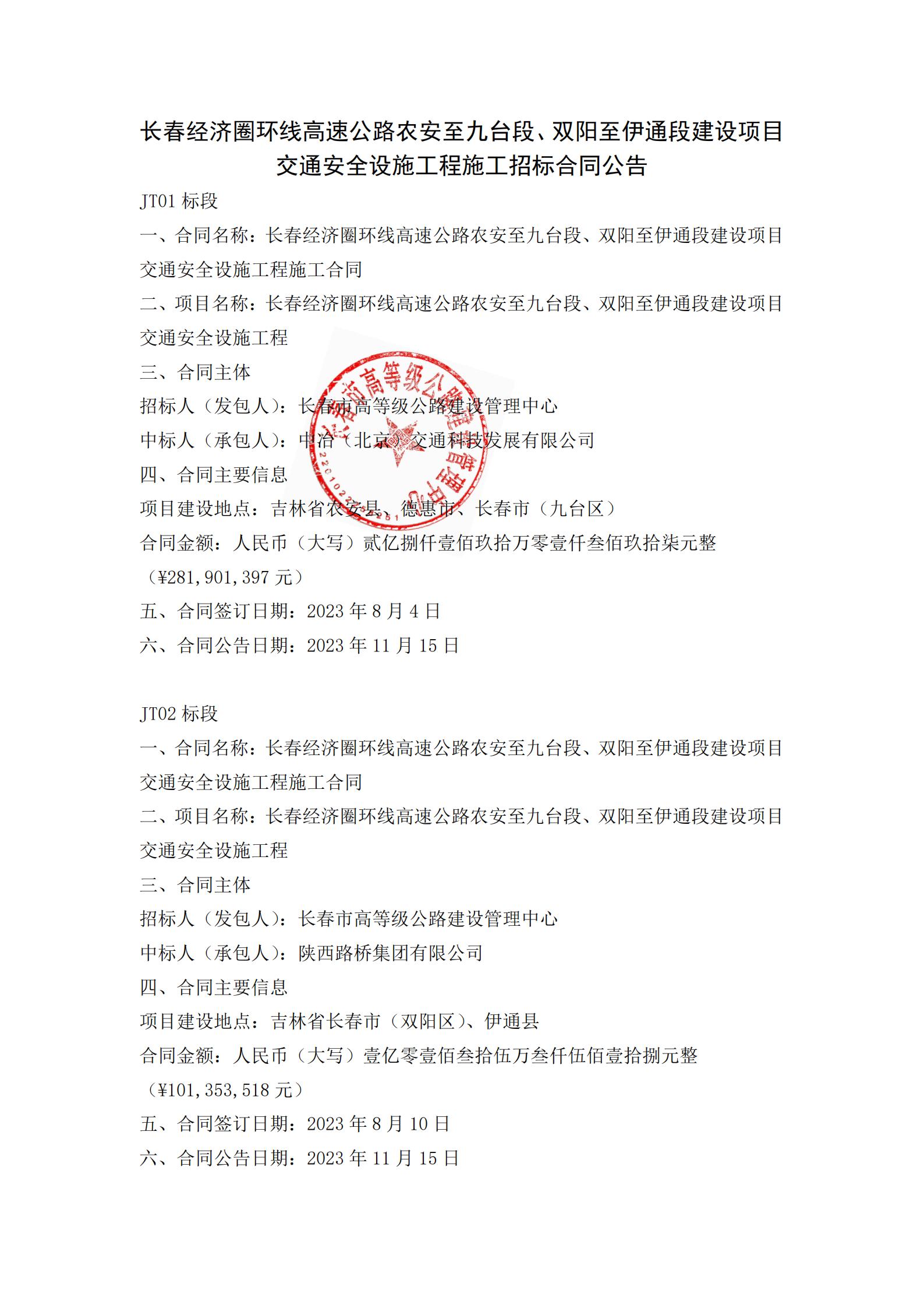 长春经济圈环线高速公路农安至九台段、双阳至伊通段建设项目交通安全设施工程施工招标合同公告