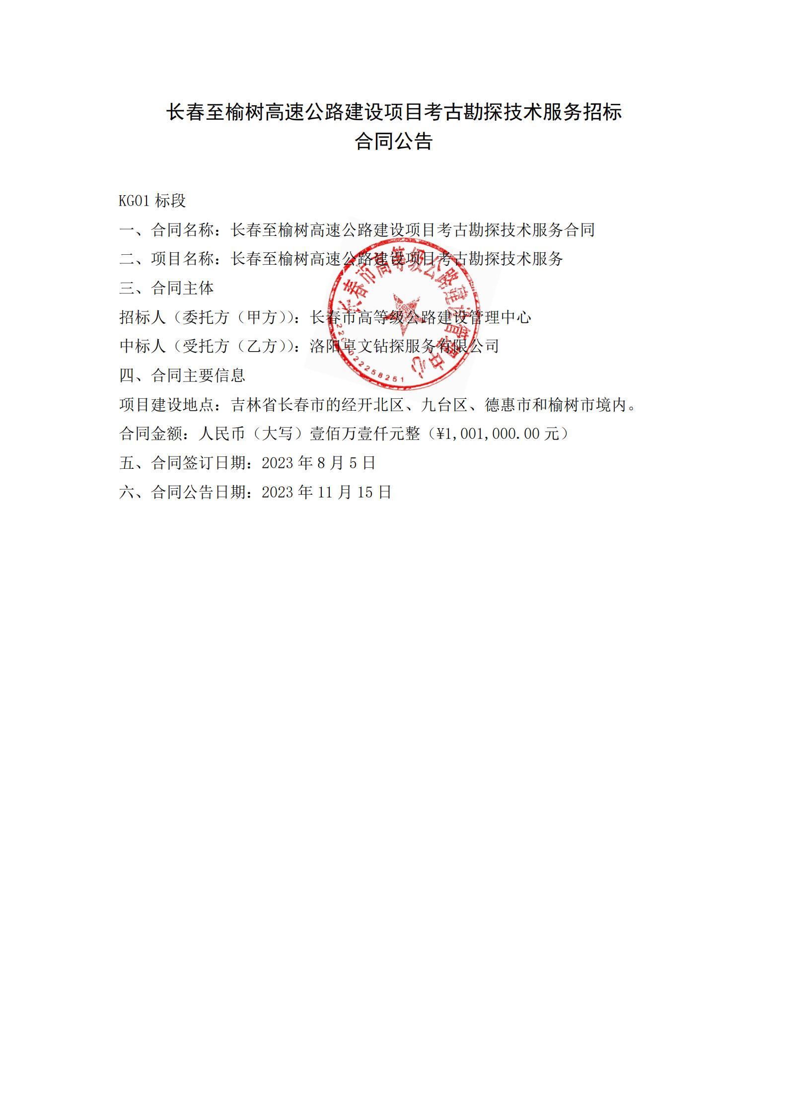 长春至榆树高速公路建设项目考古勘探技术服务招标合同公告