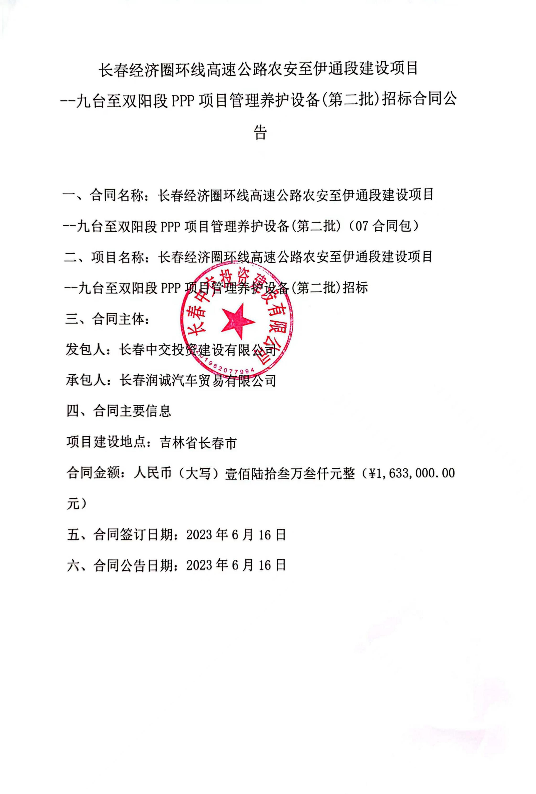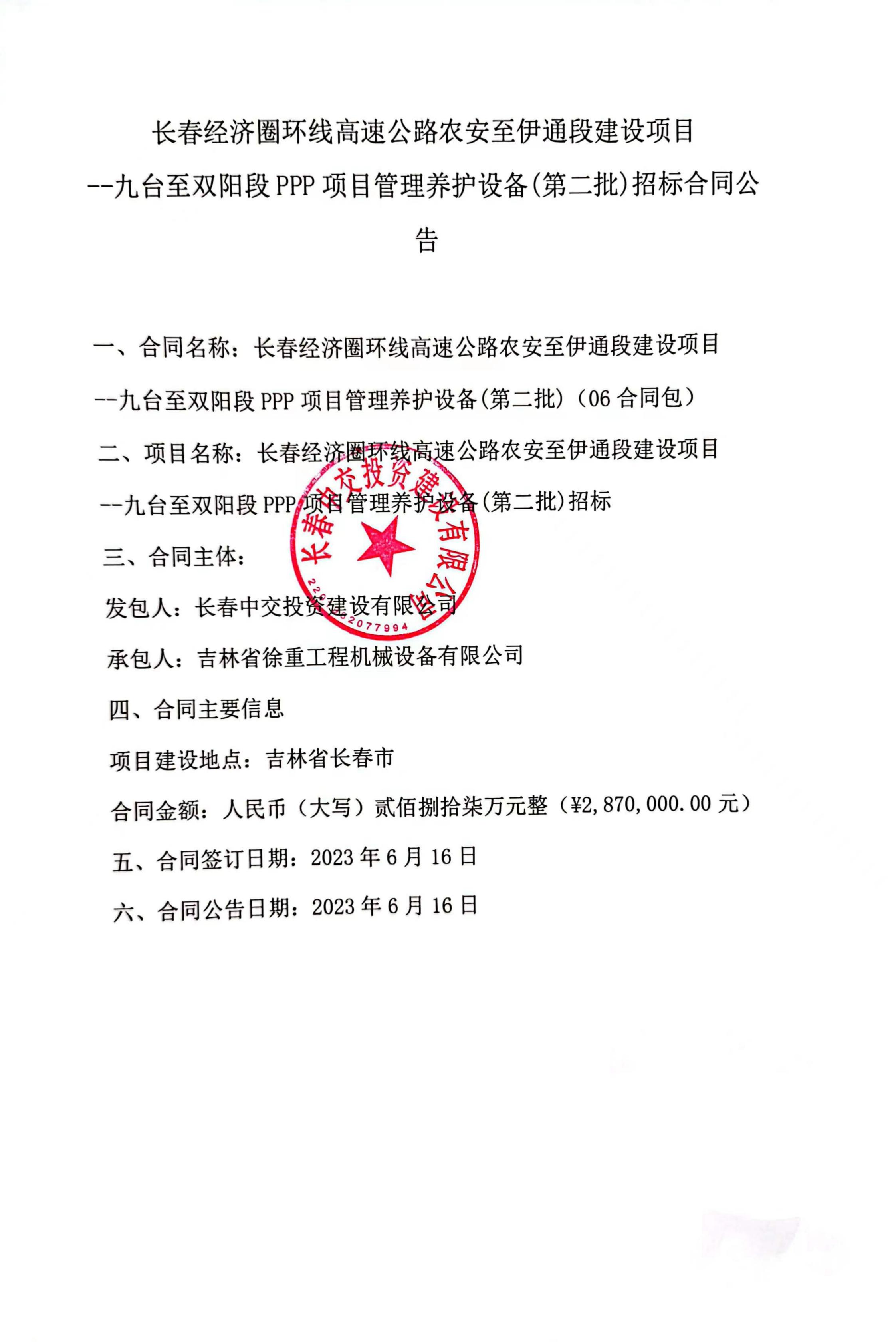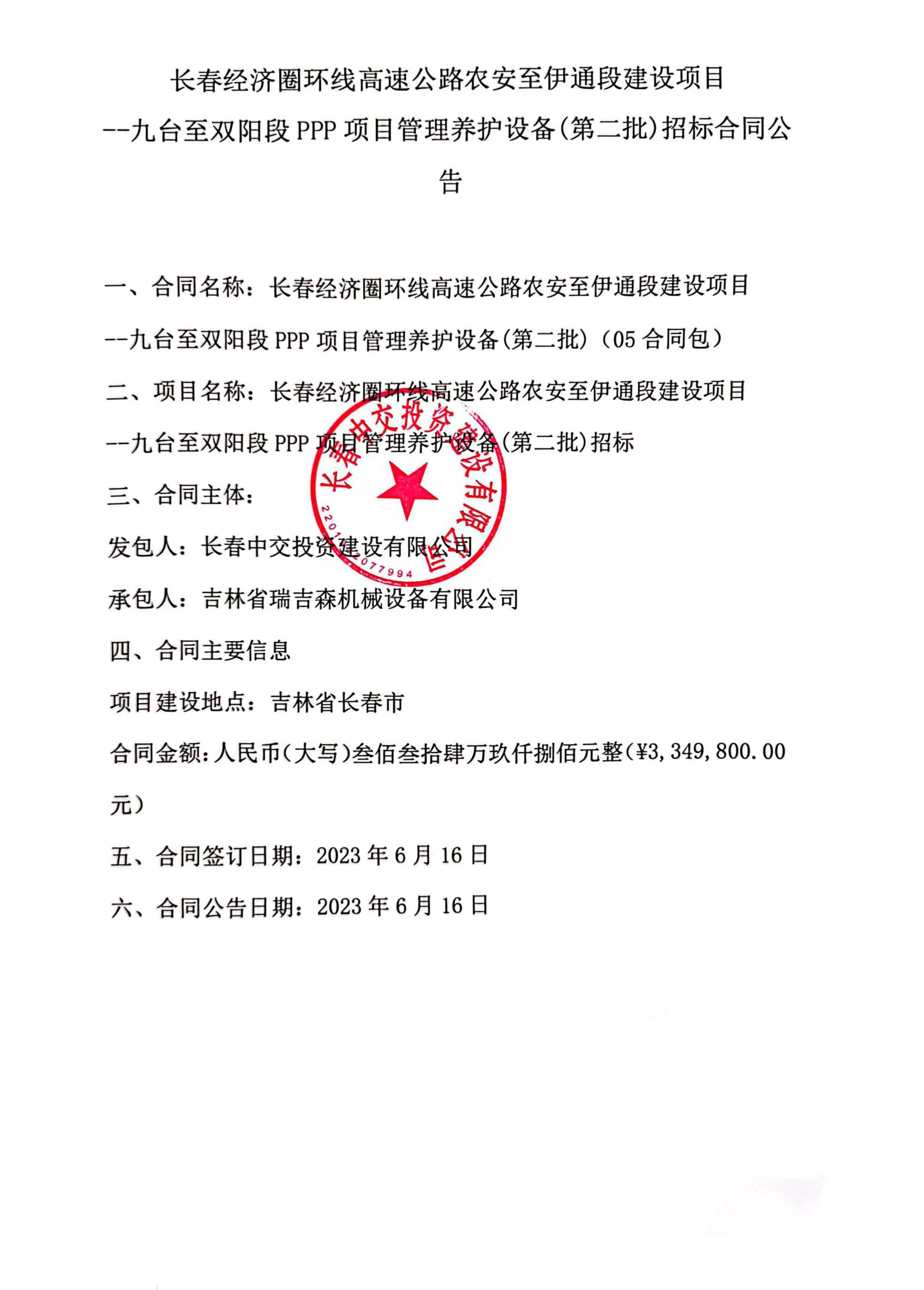 长春经济圈环线高速公路农安至伊通段建设项目 --九台至双阳段PPP项目管理养护设备(第二批)招标合同公告