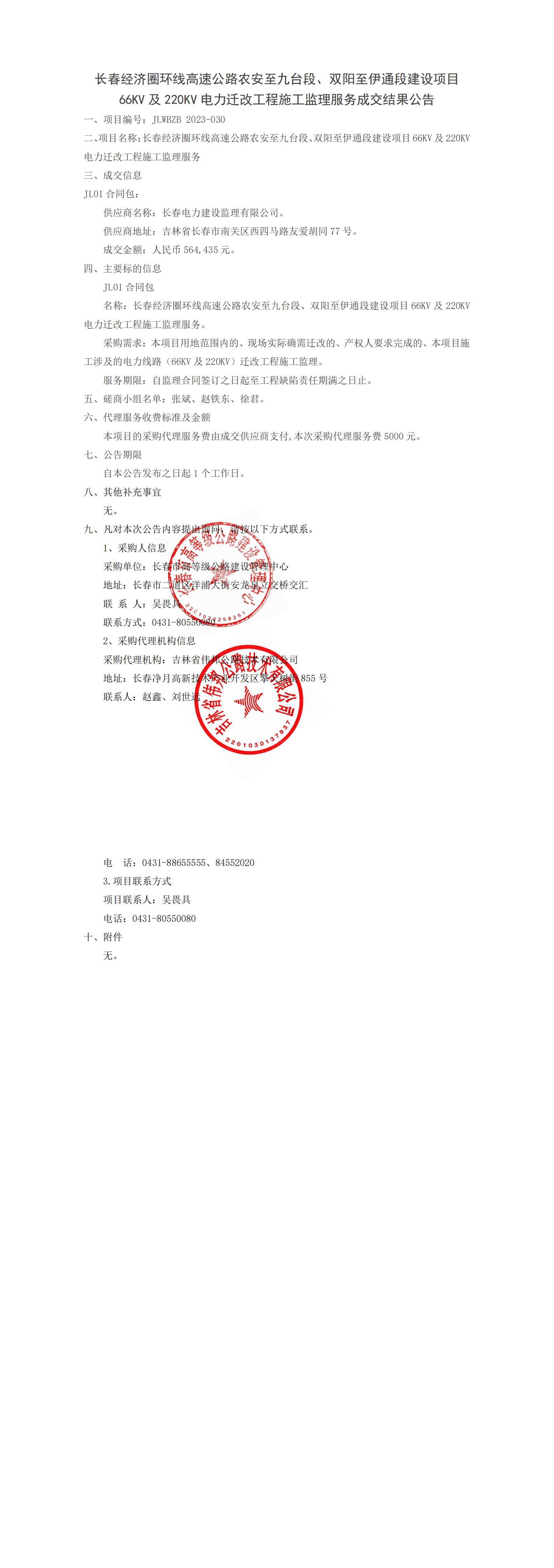 长春经济圈环线高速公路农安至九台段、双阳至伊通段建设项目66KV及220KV电力迁改工程施工监理服务成交结果公告