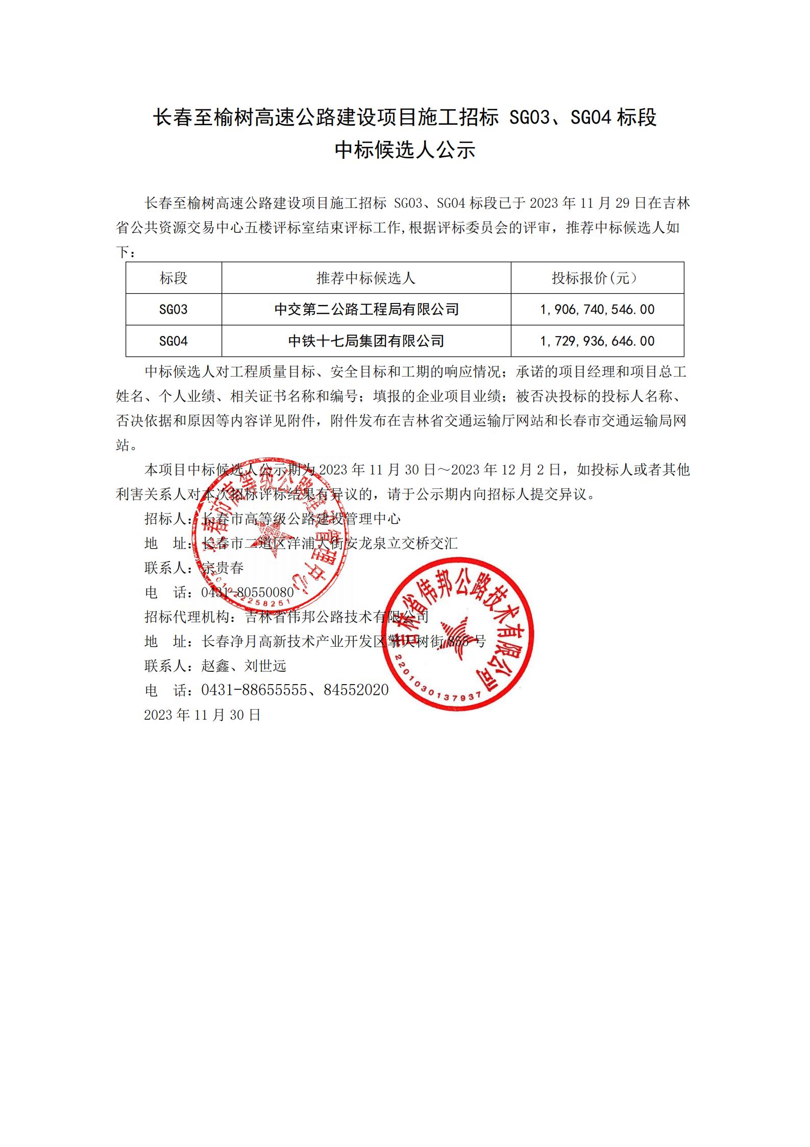 长春至榆树高速公路建设项目施工招标SG03、SG04标段中标候选人公示