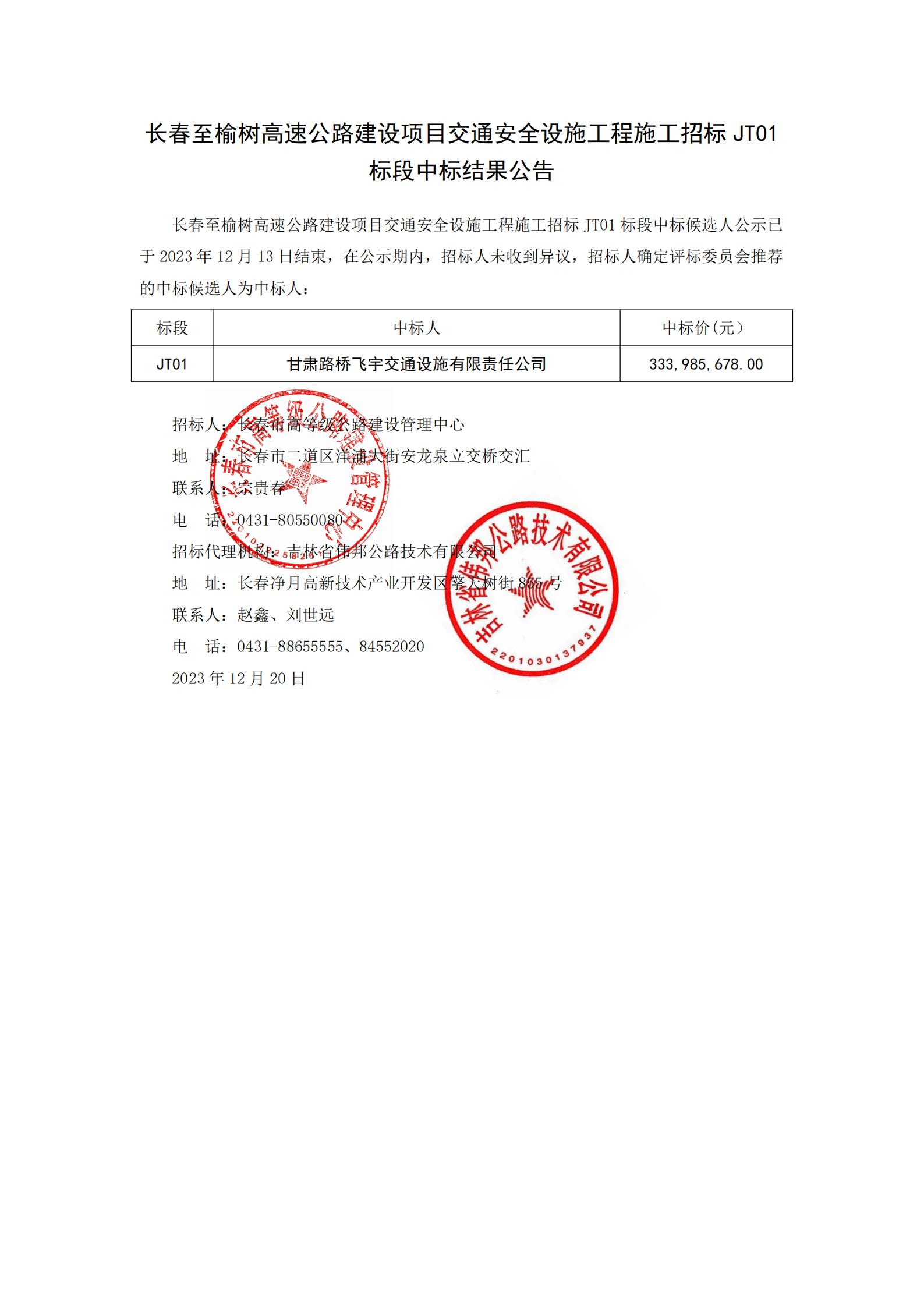 长春至榆树高速公路建设项目交通安全设施工程施工招标JT01标段中标结果公告