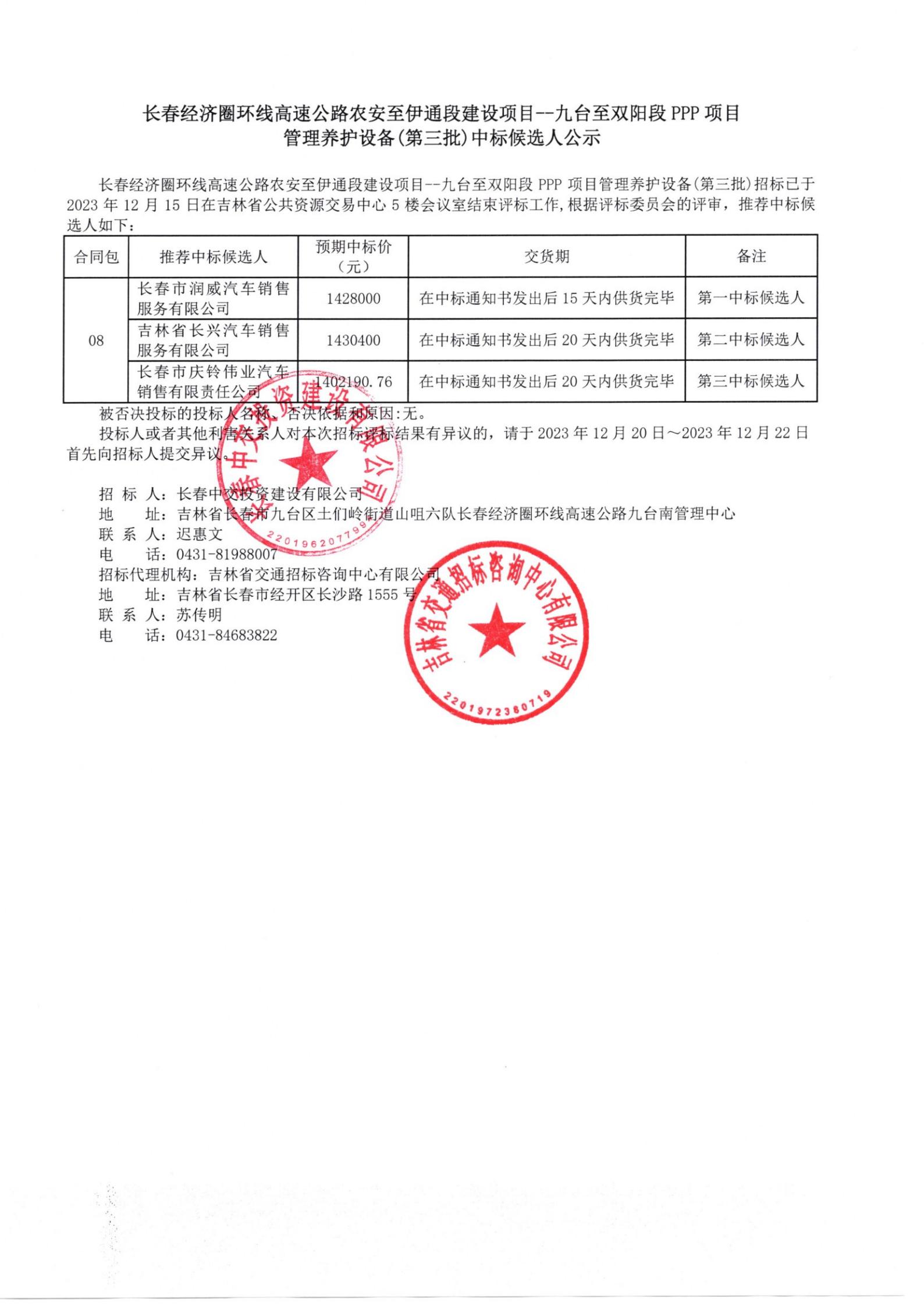 长春经济圈环线高速公路农安至伊通段建设项目--九台至双阳段PPP项目管理养护设备(第三批)中标候选人公示
