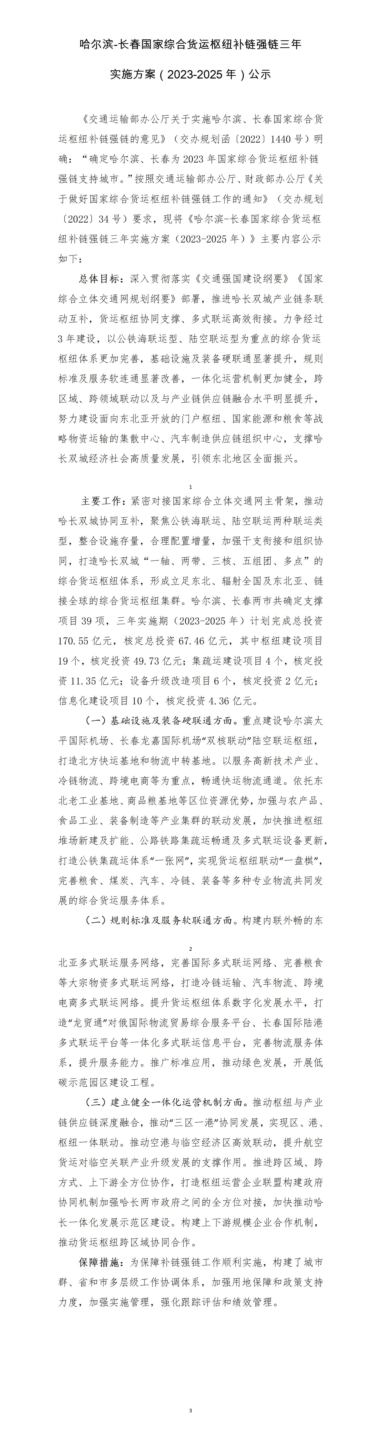 哈尔滨-长春国家综合货运枢纽补链强链三年实施方案(2023-2025年)公示