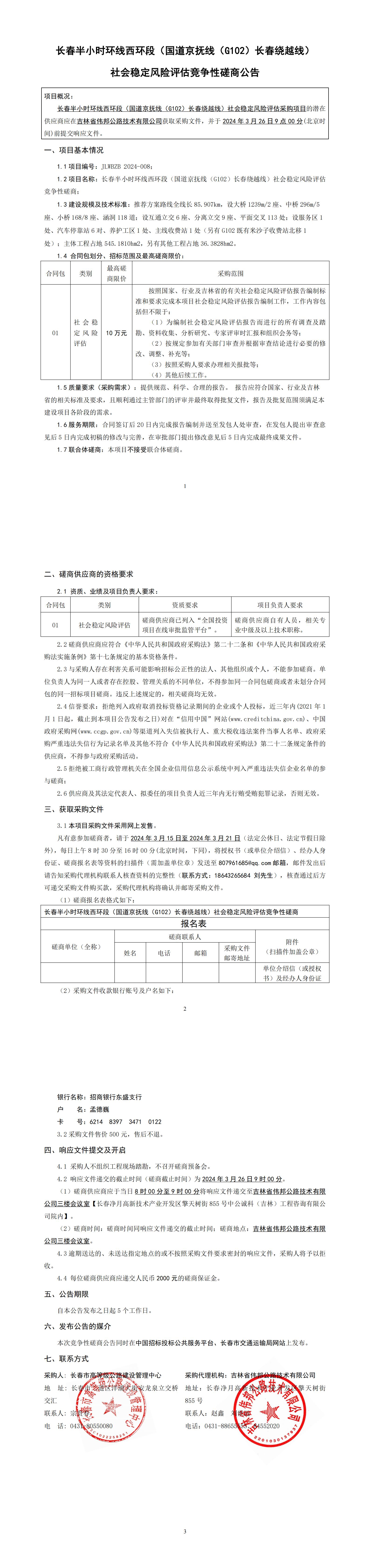 长春半小时环线西环段(国道京抚线(G102)长春绕越线)社会稳定风险评估竞争性磋商公告