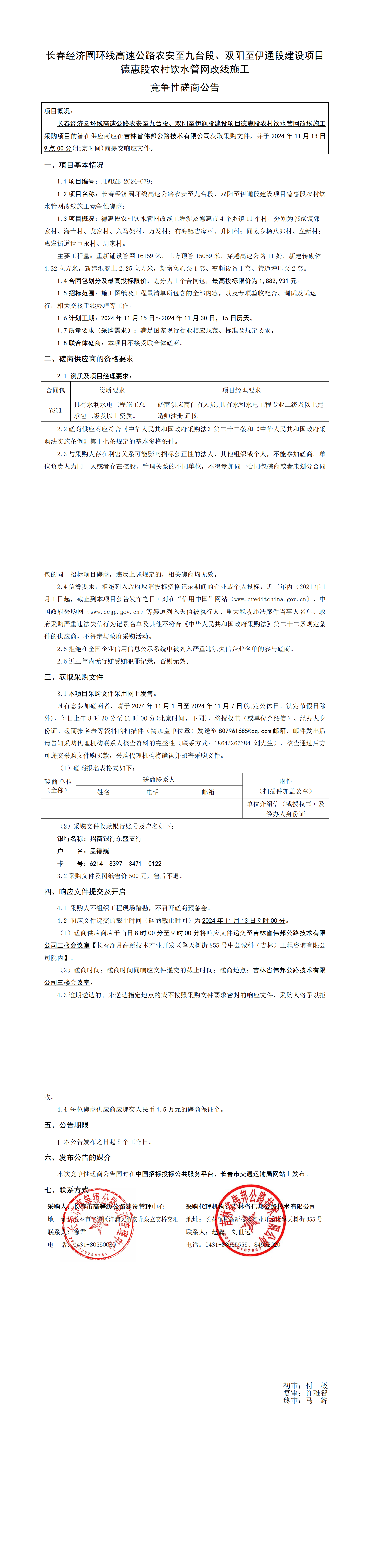 长春经济圈环线高速公路农安至九台段、双阳至伊通段建设项目德惠段农村饮水管网改线施工竞争性磋商公告