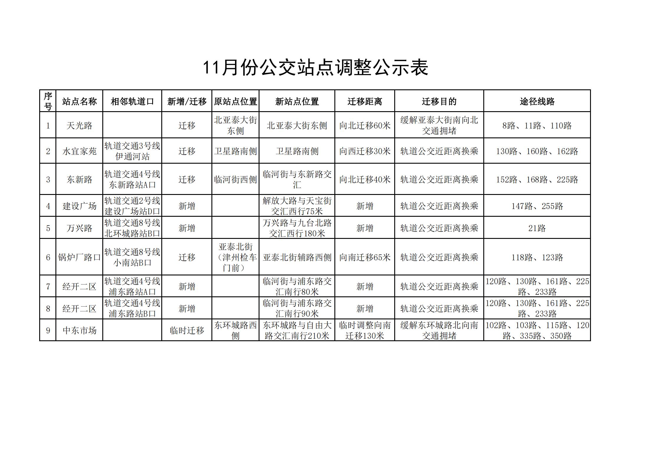 11月份公交站点调整公示表