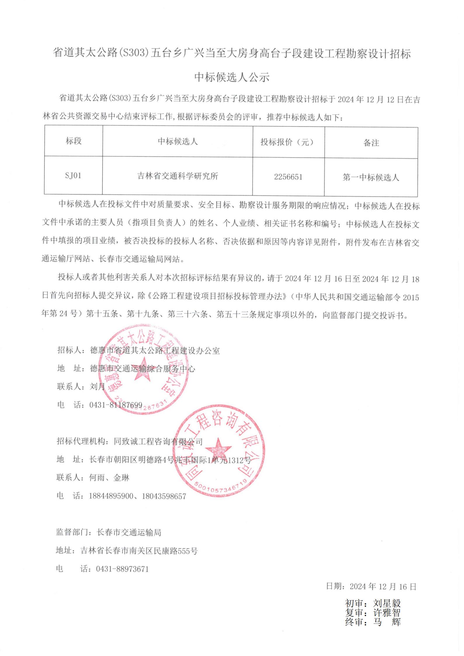 省道其太公路(S303)五台乡广兴当至大房身高台子段建设工程勘察设计招标 中标候选人公示