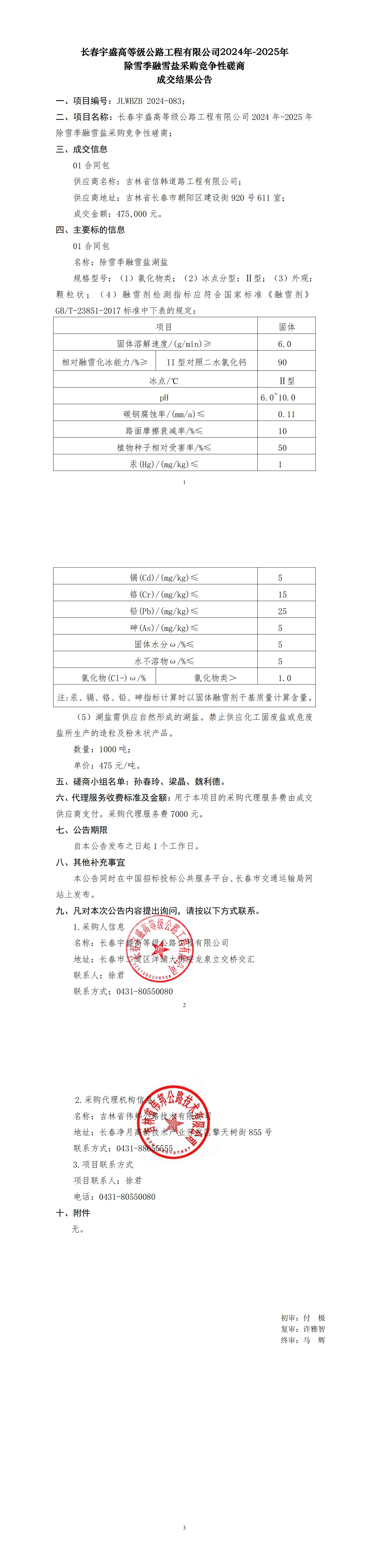 长春宇盛高等级公路工程有限公司2024年-2025年除雪季融雪盐采购竞争性磋商成交结果公告