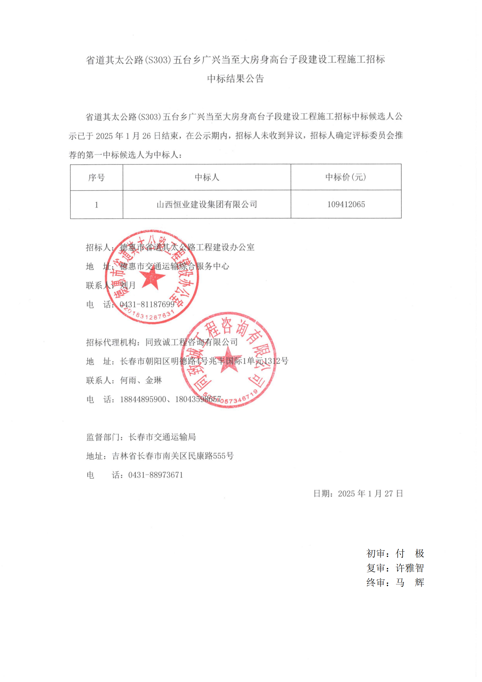 省道其太公路(S303)五台乡广兴当至大房身高台子段建设工程施工招标中标结果公告