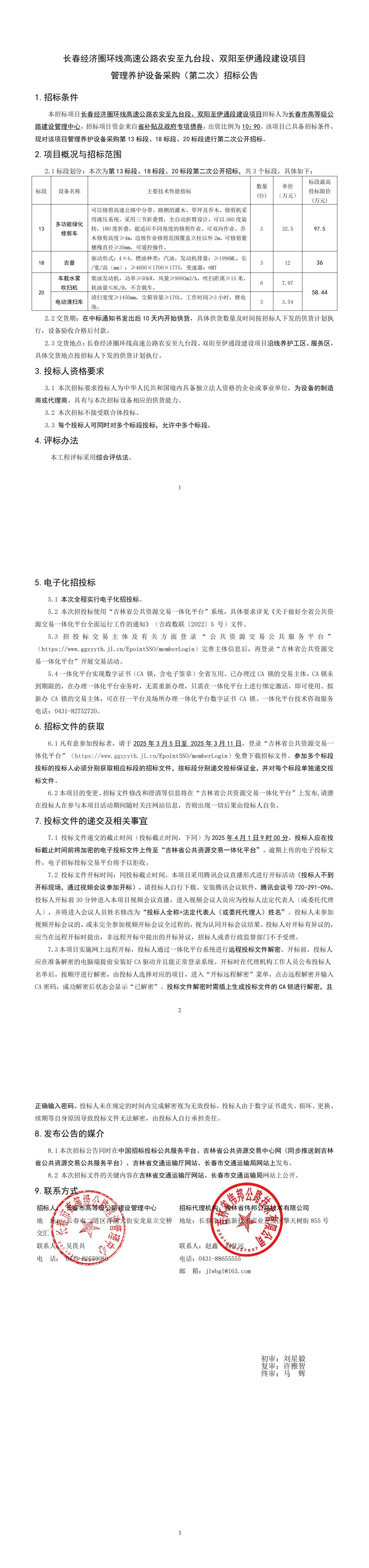 长春经济圈环线高速公路农安至九台段、双阳至伊通段建设项目管理养护设备采购(第二次)招标公告